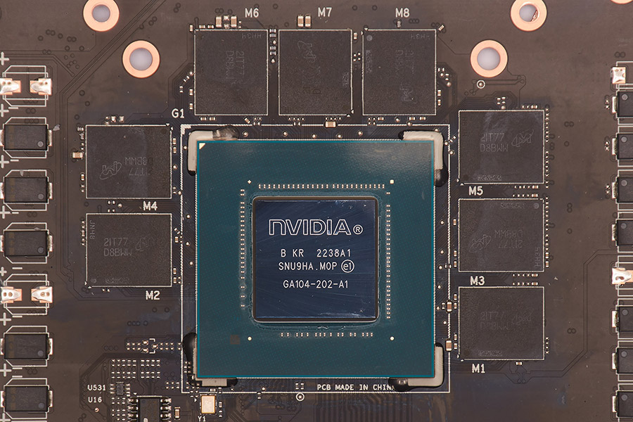 На карті встановлено чип GA104-202-A1 з відносно великим кристалом та без захисної рамки. Використовується пам’ять GDDR6X, яка на відміну від звичайної GDDR6 має збільшені частоти. Вісім чипів Micron MT61K256M32JE-19G з загальним обсягом 8 ГБ взаємодіють з GPU через 256-бітну шину.