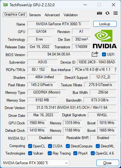 - драйвери відеокарти NVIDIA: GeForce 531.41 (для GeForce RTX 3060 Ti);