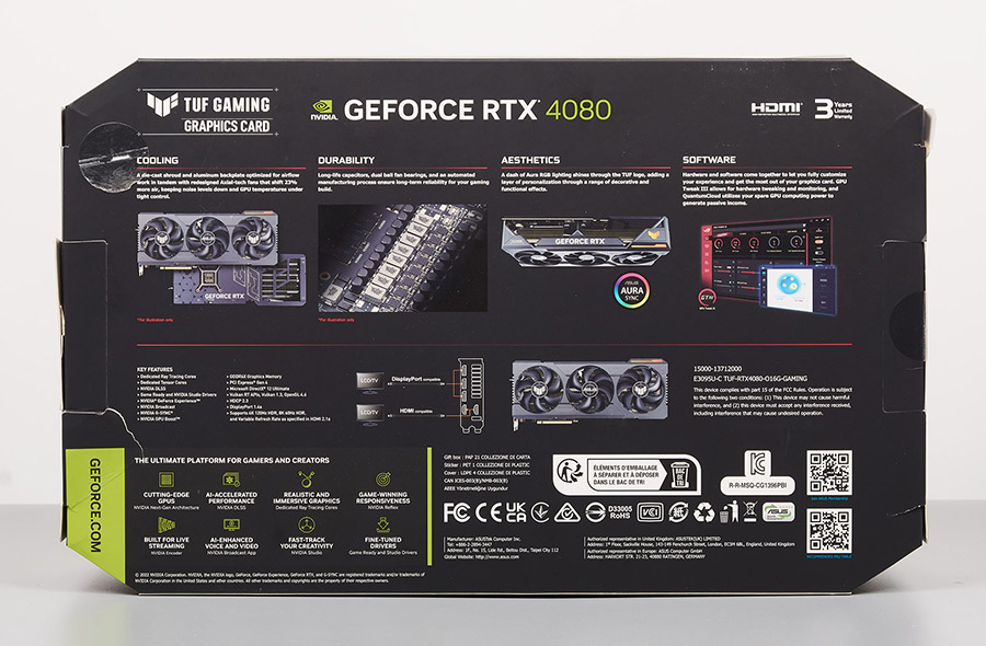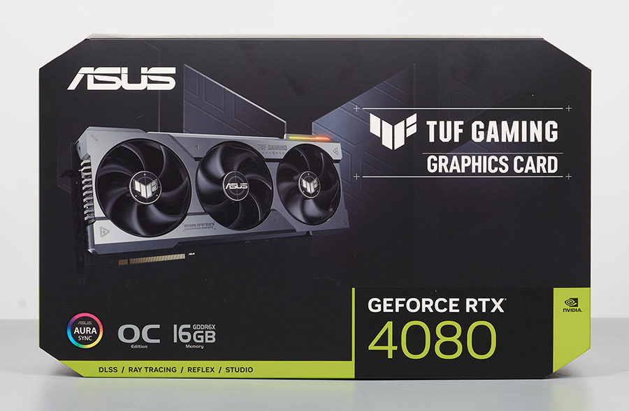 Відеокарта постачається у темній восьмигранній коробці, на якій зображена карта та її ключові характеристики. В таку саму коробку упакована й старша модель серії TUF RTX 40.