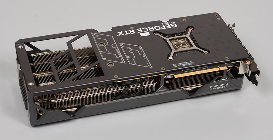 Радіатор складається з двох секцій, які пронизують дві товстих та шість тонких теплових трубок. Я довго не міг зрозуміти, чому карта при тих самих габаритах, що й TUF RTX 4090, здається легшою, адже прозір між ребрами той самий.