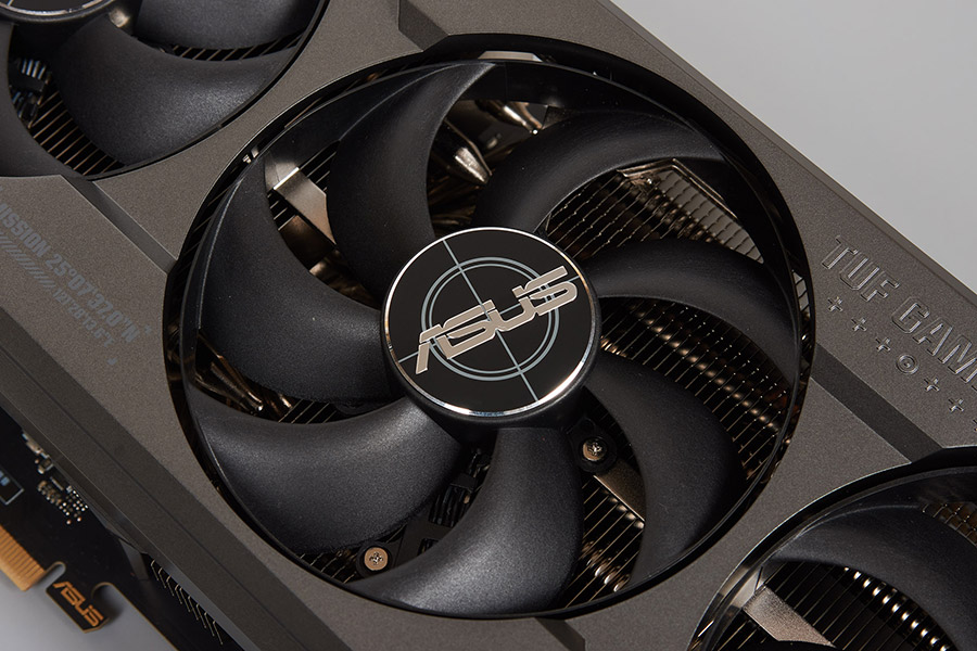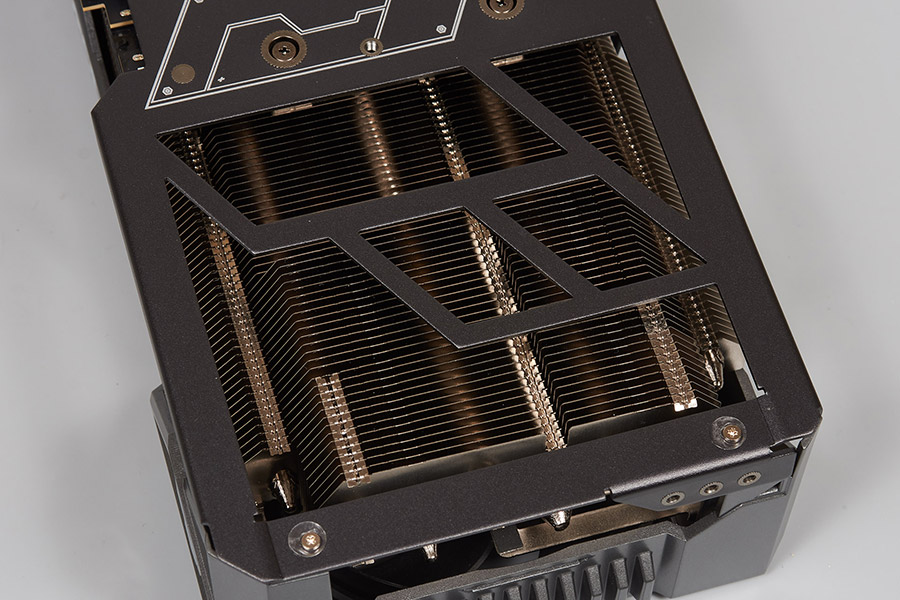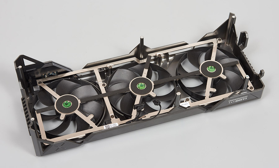 Для активного охолодження такої конструкції використовуються три вентилятори з діаметром крильчатки 105 мм та товщиною десь 15 мм. Кожен з них оснащений двома кульковими вальницями, а їх лопаті на кінцях з’єднані кільцем. Вони починають обертатися, коли температура чипа досягне позначки 55 °C, а вимикаються вже після охолодження GPU до 50 градусів. Такий алгоритм дозволяє тримати низький рівень шуму, що буде актуально при використанні карти у тихому ПК. Завдяки отворам великої площі на задній пластині вентилятор з краю зможе забезпечити додаткову циркуляцію повітря в корпусі комп’ютера.