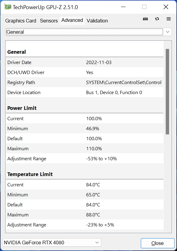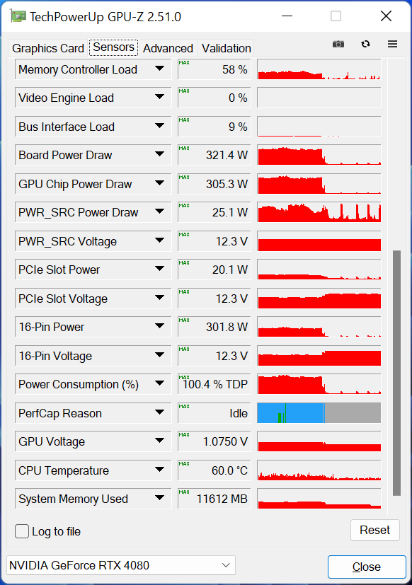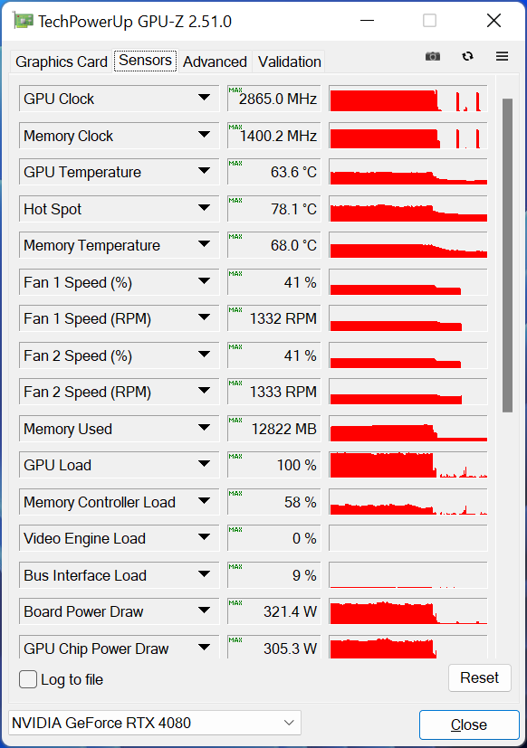 В іграх з роздільною здатністю 4К та максимальною якістю графіки частота GPU варіювалася від 2670 до 2835 МГц, тоді як діапазон у GeForce RTX 4090 був значно вуже, але стабільніший. Температура чипа була на рівні 55–60 °C.
