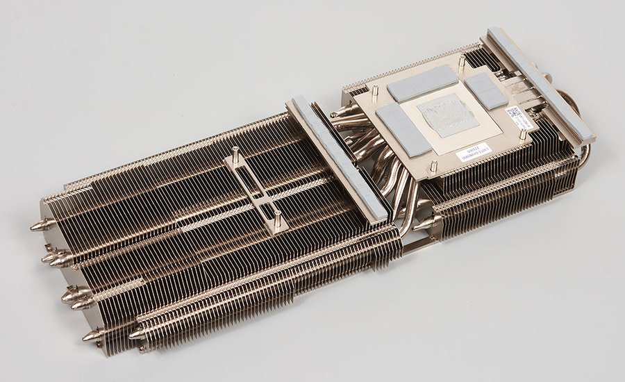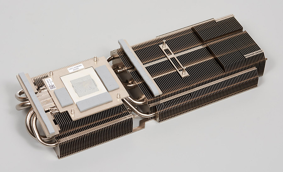Але знявши кожуха та сам радіатор, стало зрозуміло, що кількість ребер зменшена, як і число товстих теплових трубок. Також замість випарної камери тут використовується звичайна мідна пластина. Крім того, з частиною силових елементів контактує лише невеличка пластинка, тоді як в старшої моделі там був непоганий радіатор.