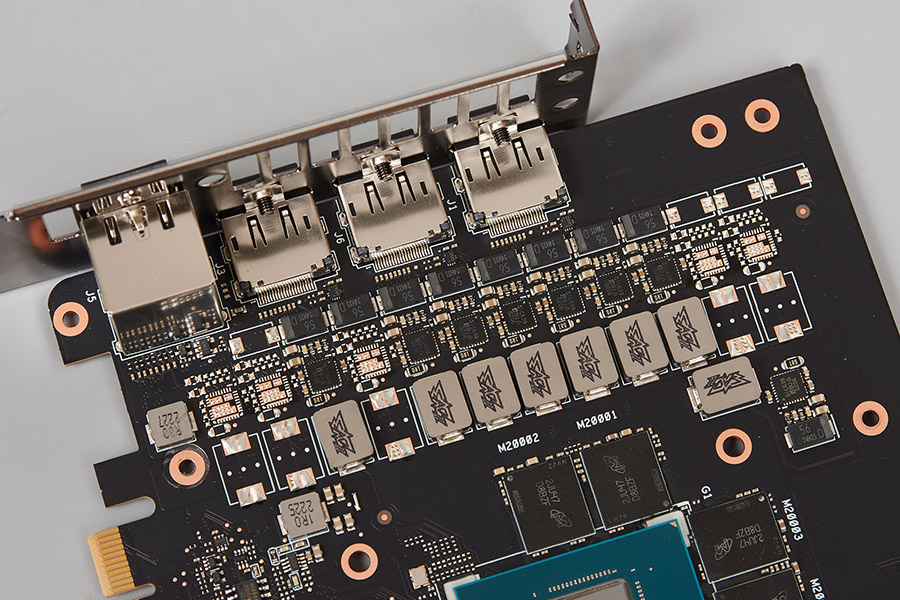 Чип довгастий, позбавлений захисної рамки та розпаяний вздовж плати. Пам’ять має обсяг 16 ГБ, набрана з восьми мікросхем Micron 2JU47D8BZF та взаємодіє з GPU через 256-бітну шину.