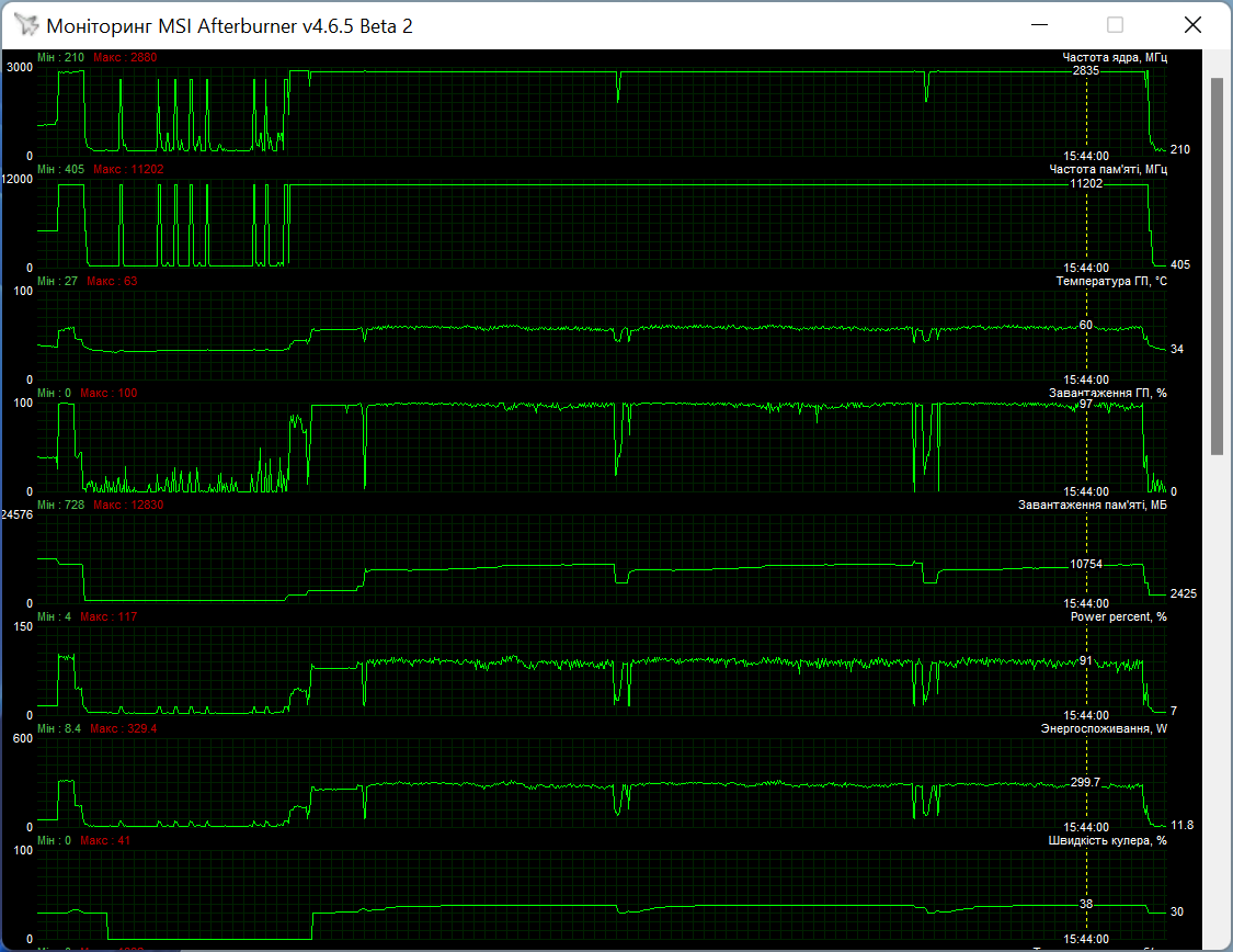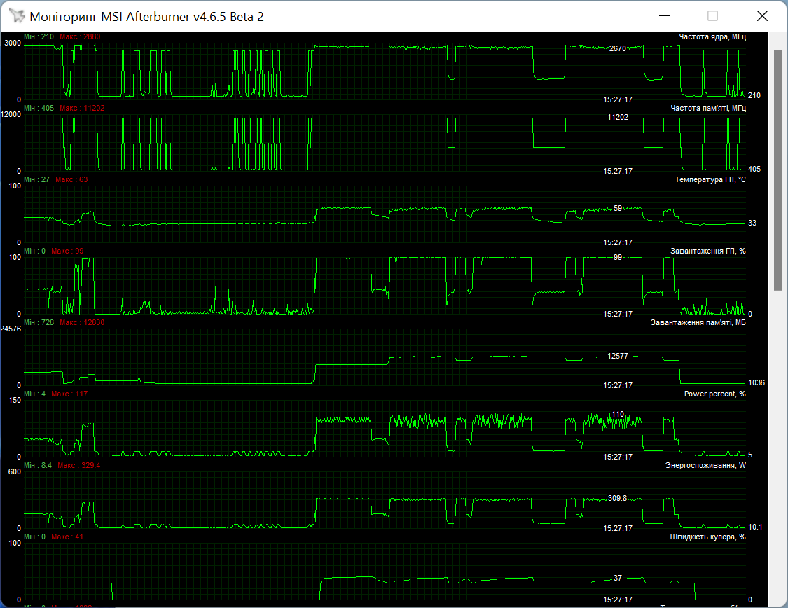 Максимальні показники були трохи вищі: пікова частота GPU складала 2865 МГц, температура досягала майже 64 градуси (78 для Hot Spot), пам’ять нагрівалася до 68 °C. Швидкість вентиляторів була на рівні 1333 об/хв. Але це при 20 градусах у приміщенні та в інших умовах все може бути по іншому.