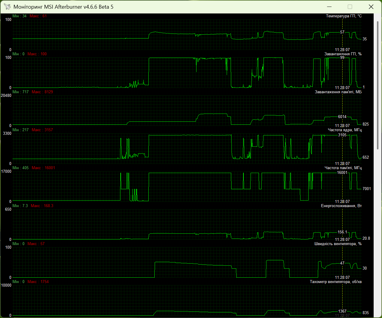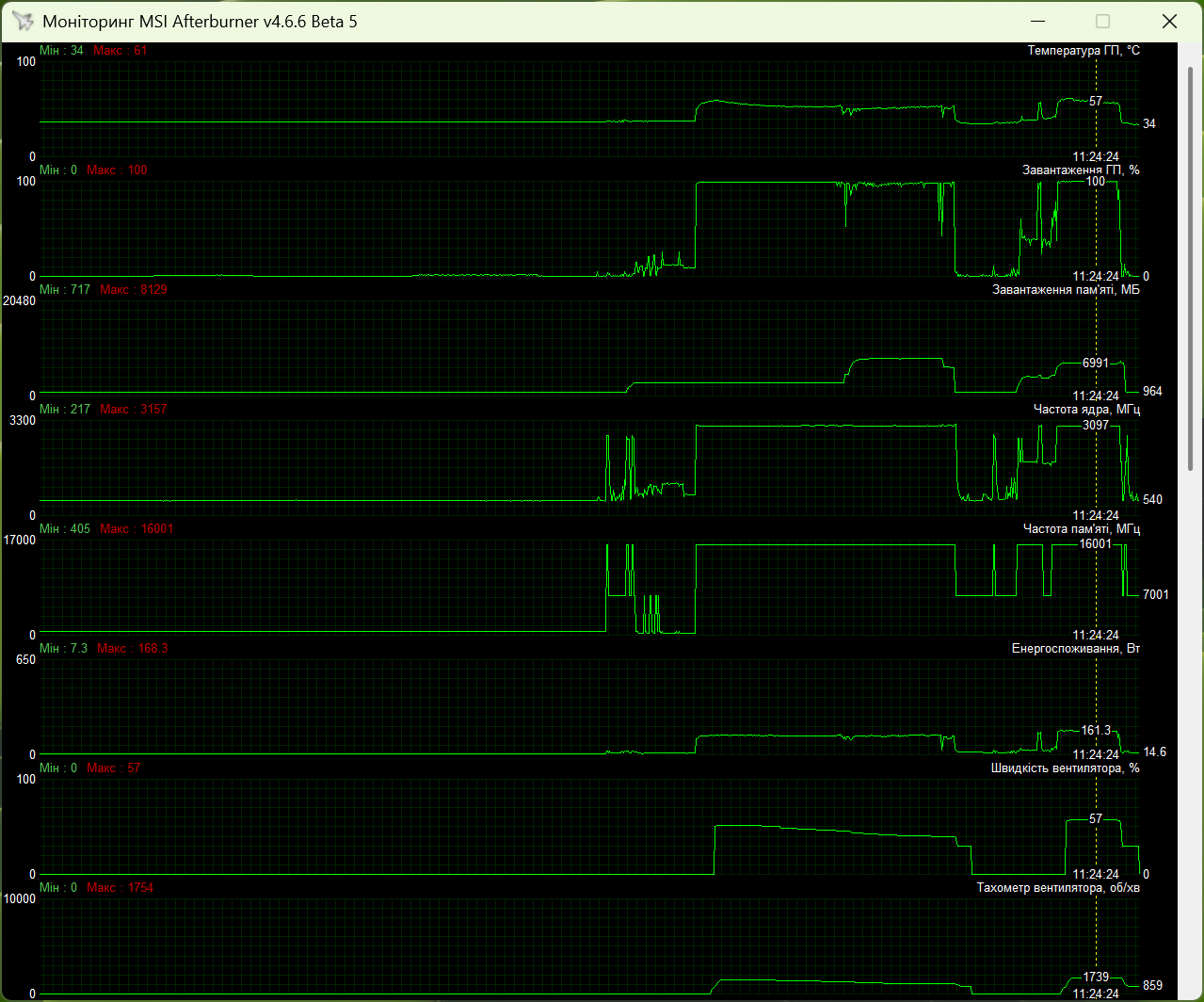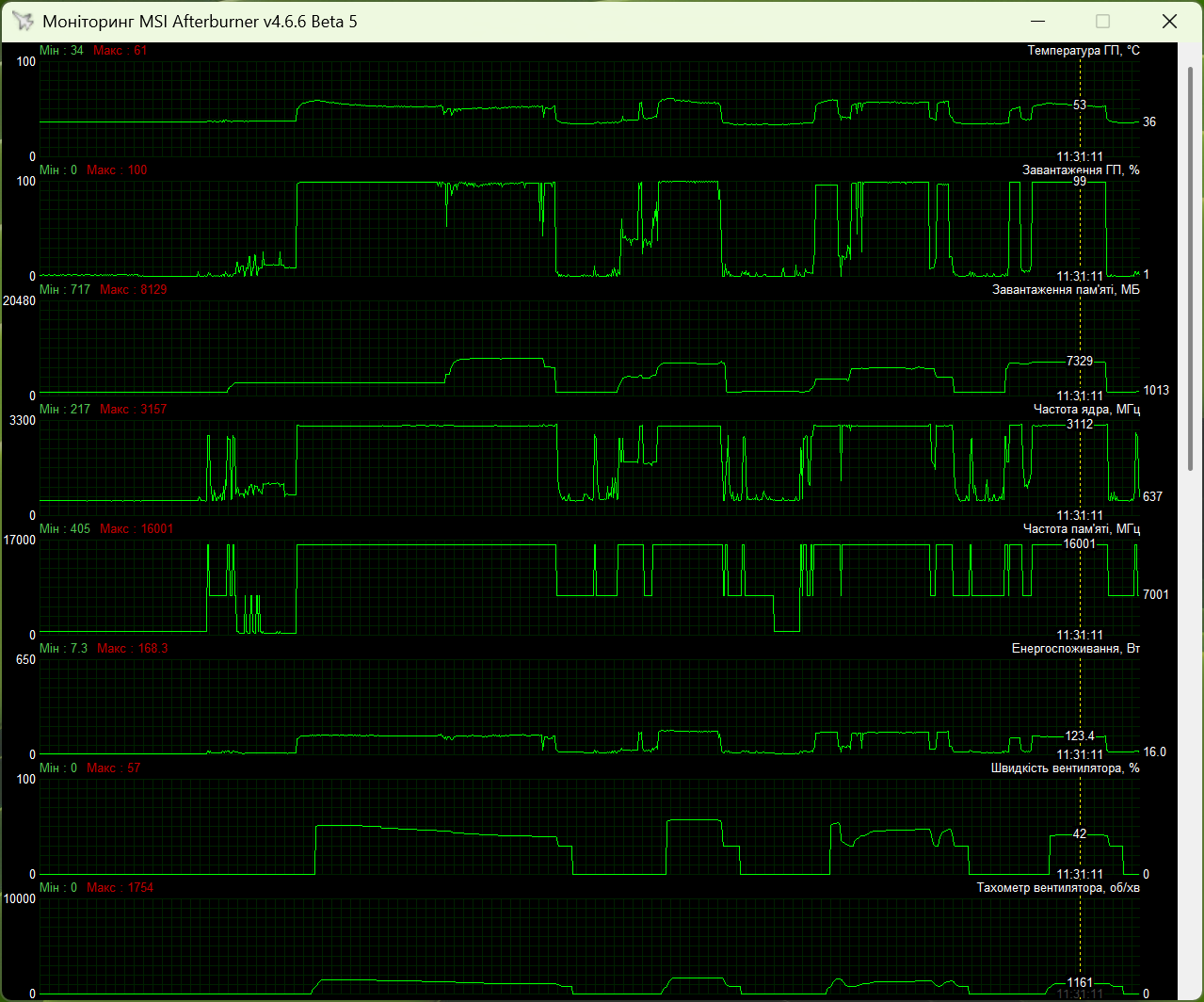 Тепер GPU нагрівався до 61,2 °C, а пам’ять була на тому самому рівні у 60 °C. Швидкість вентиляторів складала максимум 1754 об/хв, а рівень шуму був 36,7 дБ(А).
