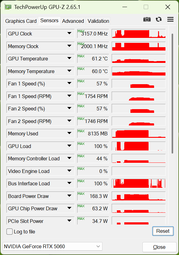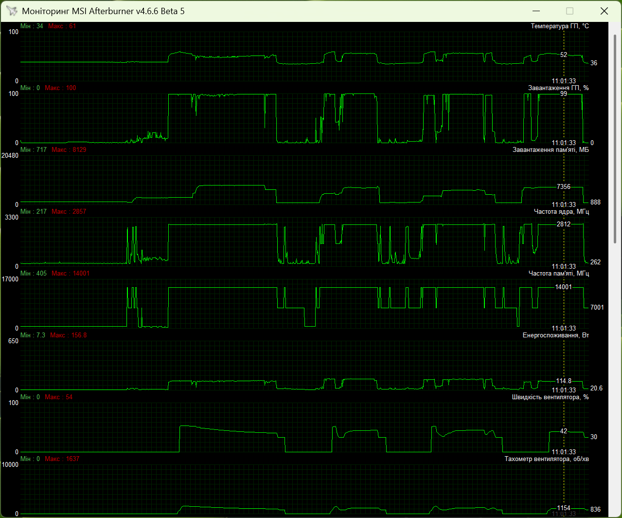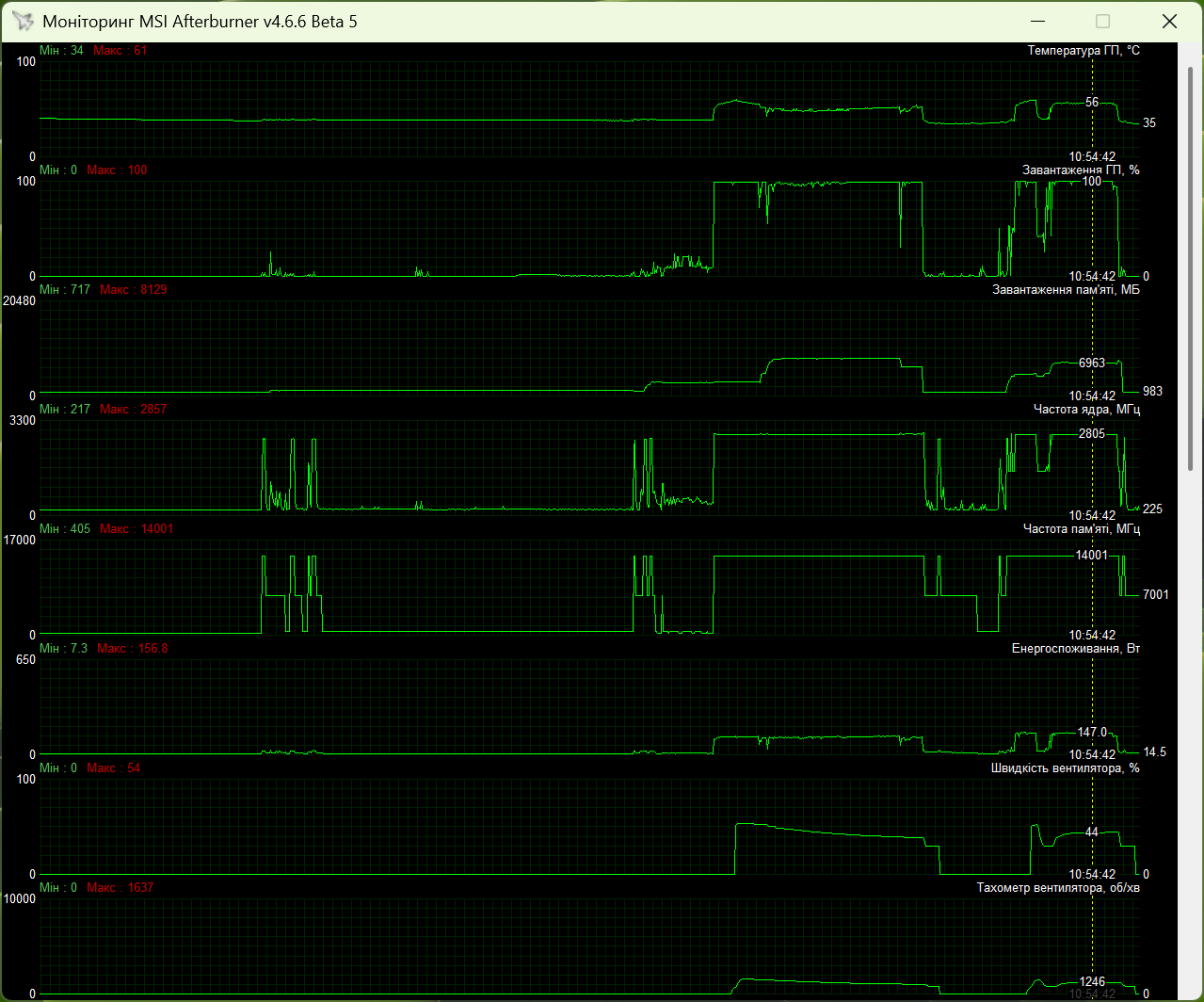 Тепер GPU нагрівався до 61,2 °C, а пам’ять була на тому самому рівні у 60 °C. Швидкість вентиляторів складала максимум 1754 об/хв, а рівень шуму був 36,7 дБ(А).