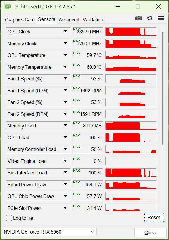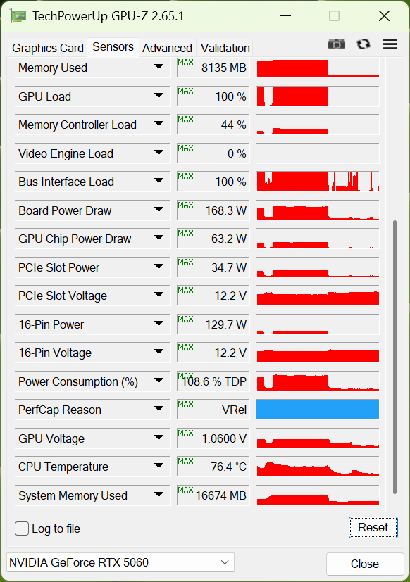 Температура графічного процесора дорівнювала 59,7 °C, тоді як пам’яті — 60 °C при 20 градусах у приміщенні та відкритому корпусі. Швидкість вентиляторів сягала 1602 об/хв, а максимальний рівень шуму складав 34,8 дБ(А). Крім того, дроселі при великій кількості fps вже дають про себе знати, хоча й не так сильно, як це буває в старших моделях відеокарт. Цікаво, що в ASUS PRIME-RTX5060TI-O16G з цим жодних проблем.