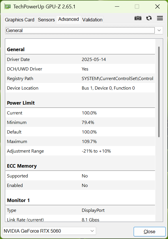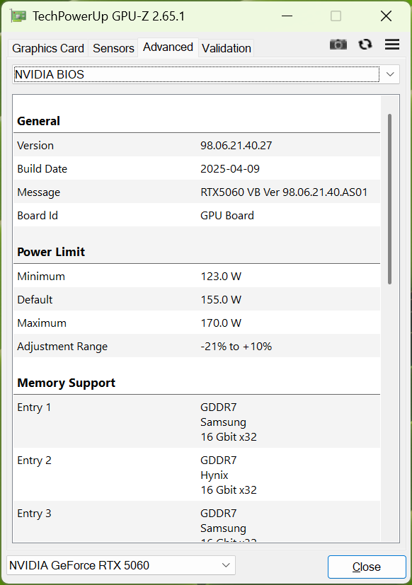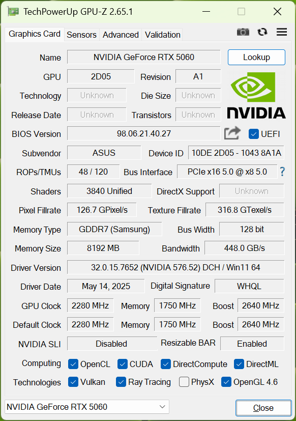З характеристиками новітньої карти можна познайомитися в першому огляді GeForce RTX 5060 Ti, але варто нагадати основні відмінні риси чергового Blackwell. Карта базується на чипі GB206 з 3840 потоковими процесорами, 120 текстурними блоками та 48 блоками растеризації. Також він має 120 тензорних ядер та 30 прискорювачів трасування променів. Працює GPU на частоті 2280 МГц, яка може автоматично збільшуватися до 2497 МГц, якщо навантаження та температура в межах прийнятних. Пам’ять стандарту GDDR7 взаємодіє з чипом через 128-бітову шину, має загальний обсяг у 8 Гбайт та швидкість на рівні 28 ГТ/с. Кількість ліній інтерфейсу PCI Express 5.0 тут обмежена вісьмома штуками, що може вплинути на продуктивність карти в старих системах з PCIe 4.0/3.0. Споживання новинки обмежене позначкою у 145 Вт, а її ціна — 299 доларів, хоча у реальності моделі від AIB-партнерів десь у 1,5 раза дорожчі.
