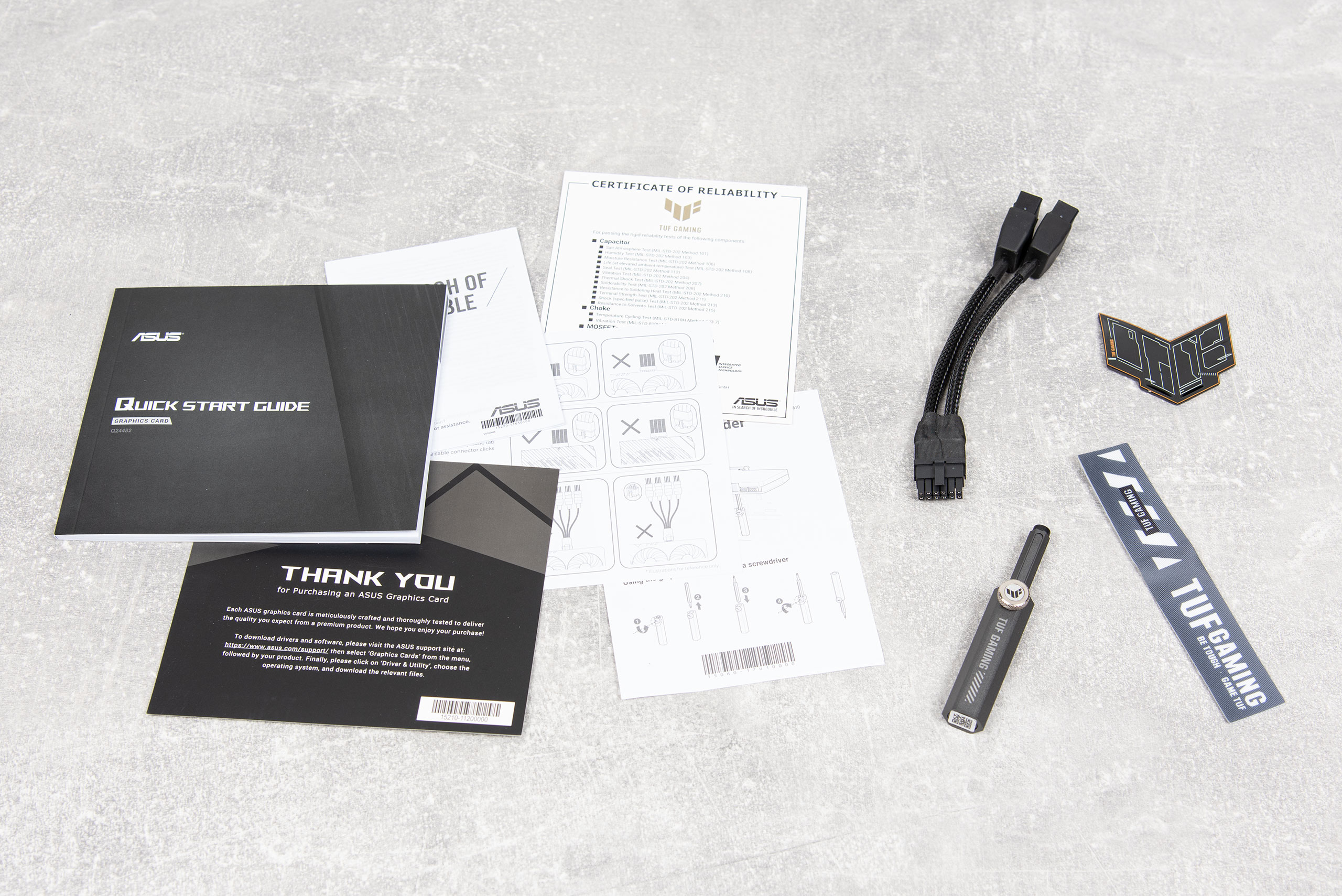 В комплекті наявні документація, включно з сертифікатом якості та подяки за обраний продукт, магнітна наліпка, стяжка-липучка, стійка-викрутка та перехідник живлення з двох звичайних 8‑контактних роз’ємів на один 12VHPWR.