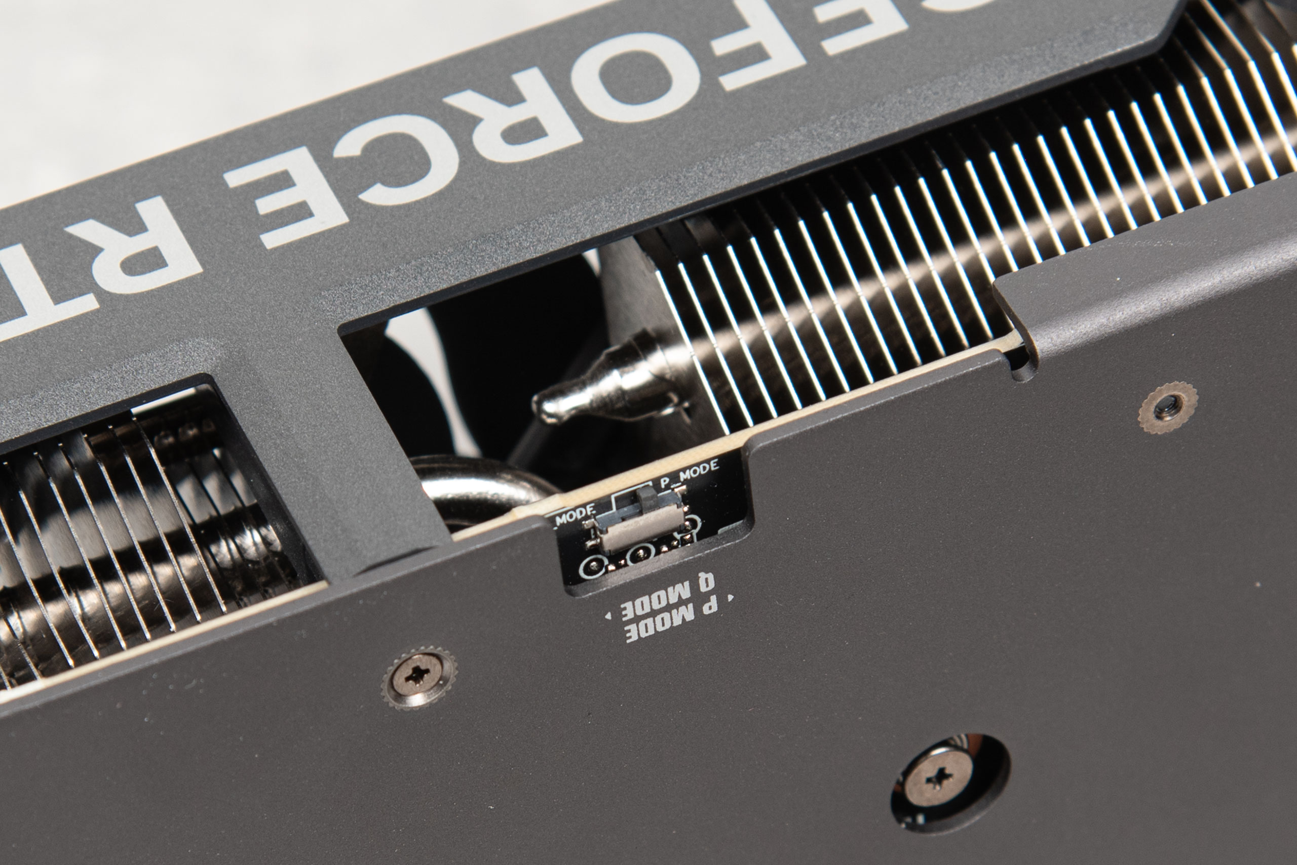 Присутній вибір режиму роботи відеокарти, тихий або продуктивний, для чого достатньо задіяти перемикач на зворотному боці пристрою.
