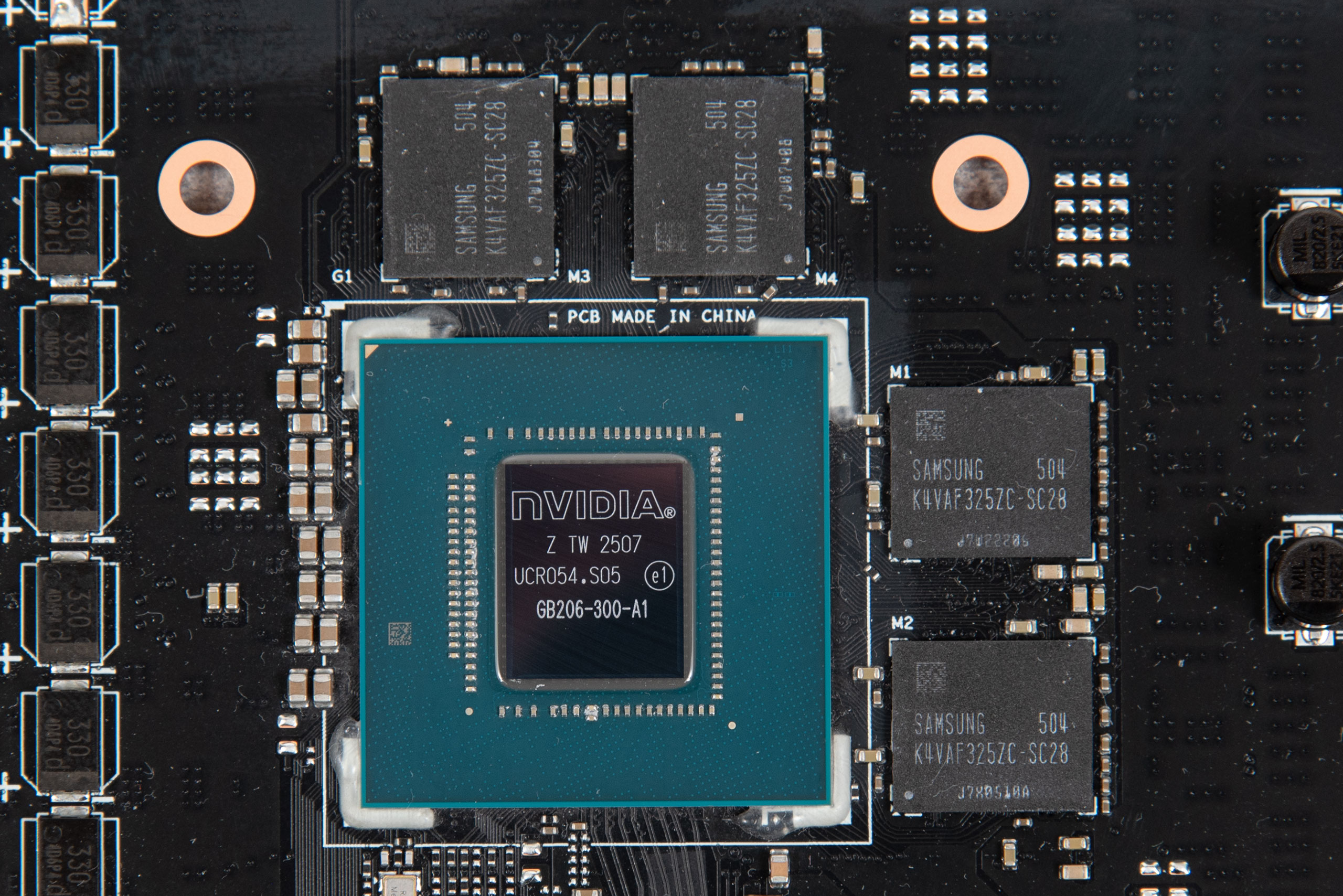 Чип GB206-300-A1 майже квадратної форми та позбавлений захисної рамки. З пам’яттю GDDR7 він взаємодіє через 128-бітову шину. Вісім мікросхем пам’яті Samsung K4VAF325ZC-SC28 розміщені по чотири штуки з обох боків друкованої плати.