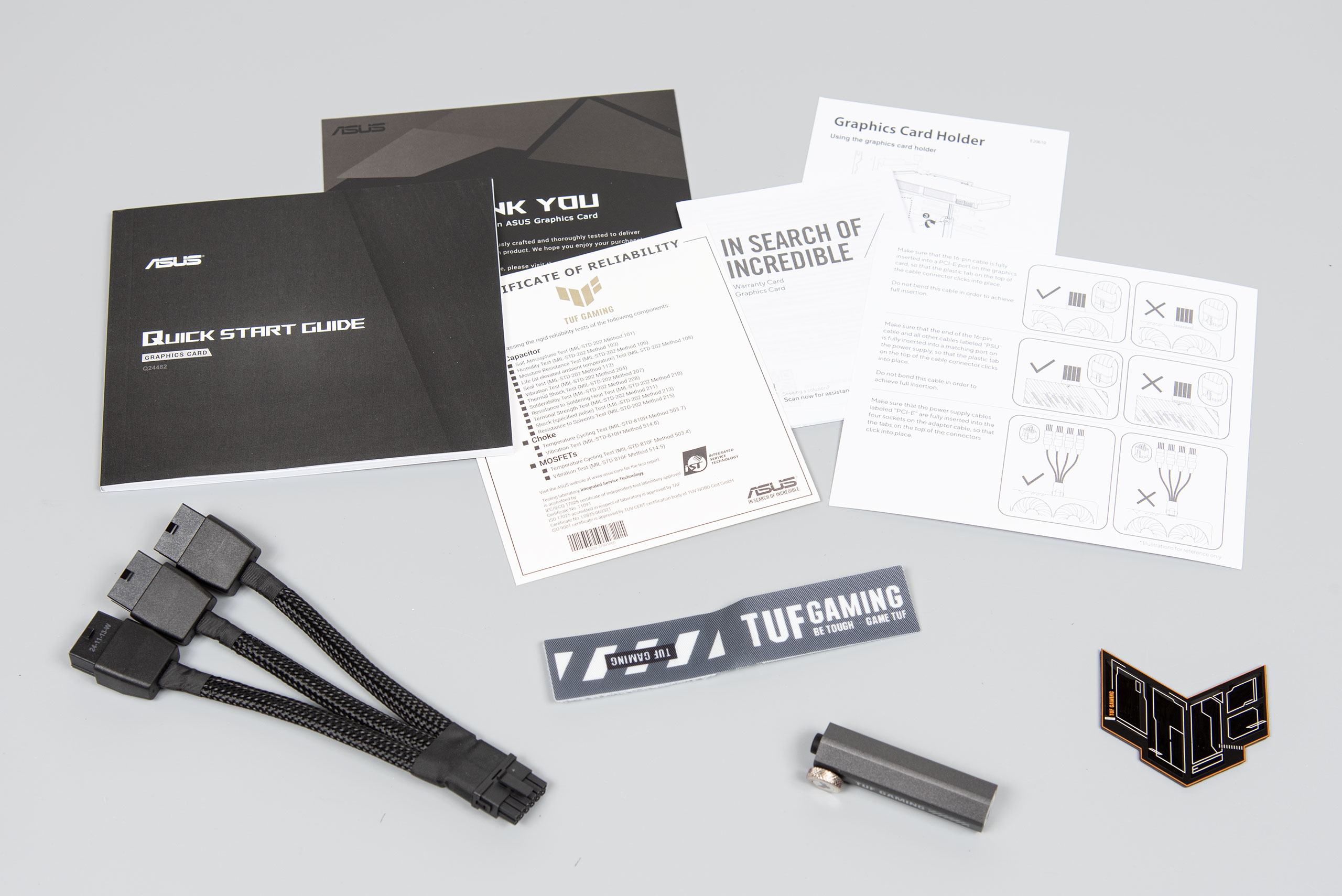 В комплекті постачання присутні документація, сертифікат якості, металева наліпка з логотипом серії TUF Gaming, стяжка-липучка, стійка та перехідник живлення з трьох звичайних 8-контактних роз’ємів на 12VHPWR.
