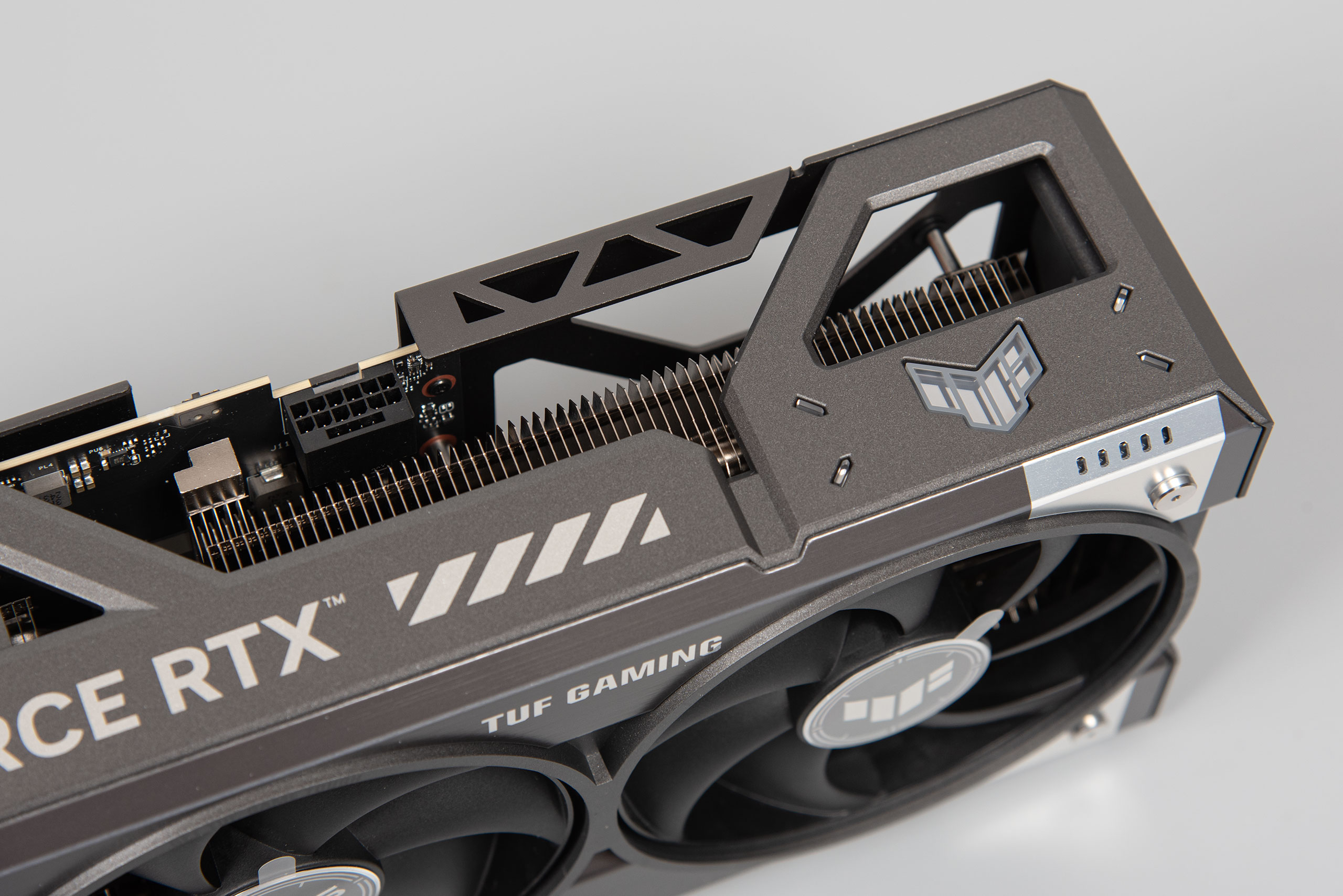 Роз’єм живлення розміщено майже по центру карти, ближче до внутрішнього торця, у верхній частині якого є маленький логотип TUF та чотири риски з RGB-підсвіткою.