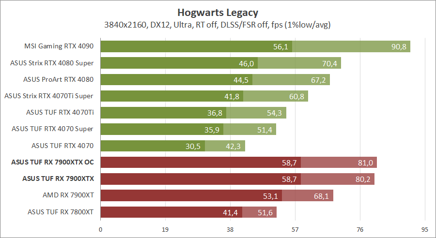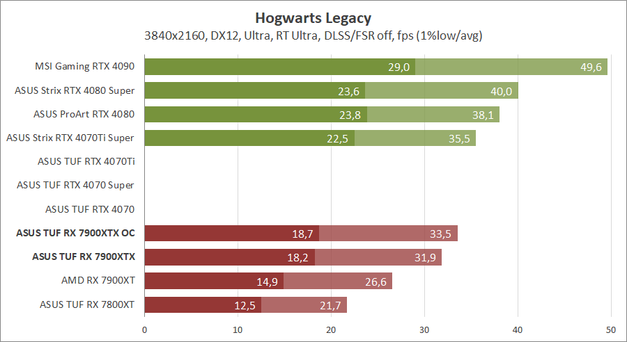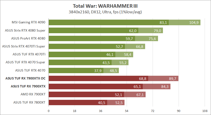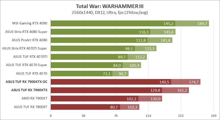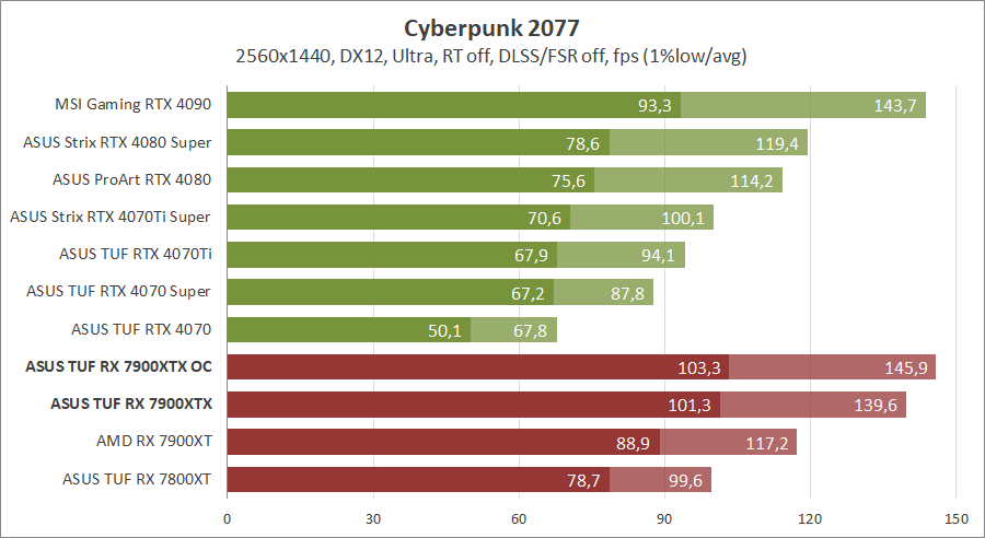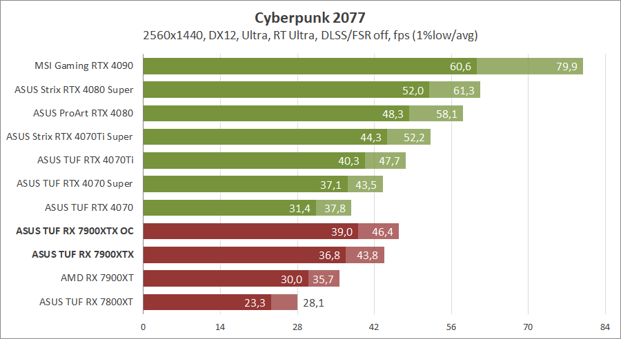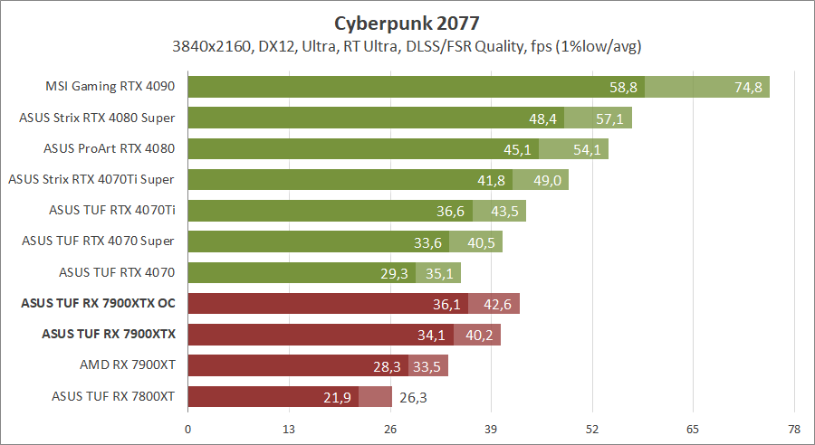 Для порівняння візьмемо карти MSI GeForce RTX 4090 Gaming X Trio, ASUS ROG-STRIX-RTX4080S-O16G-GAMING, PROART-RTX4080-O16G, ROG-STRIX-RTX4070TIS-O16G-GAMING, TUF-RTX4070S-O12G-GAMING з TUF-RTX4070TI-O12G-GAMING та TUF-RTX4070-O12G-GAMING, а також референсну Radeon RX 7900 XT з ASUS TUF-RX7800XT-O16G-GAMING.