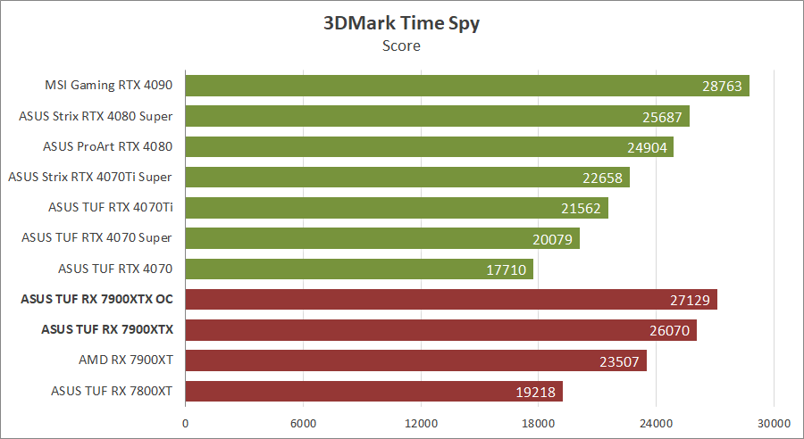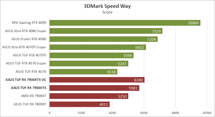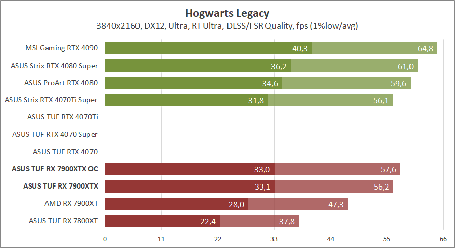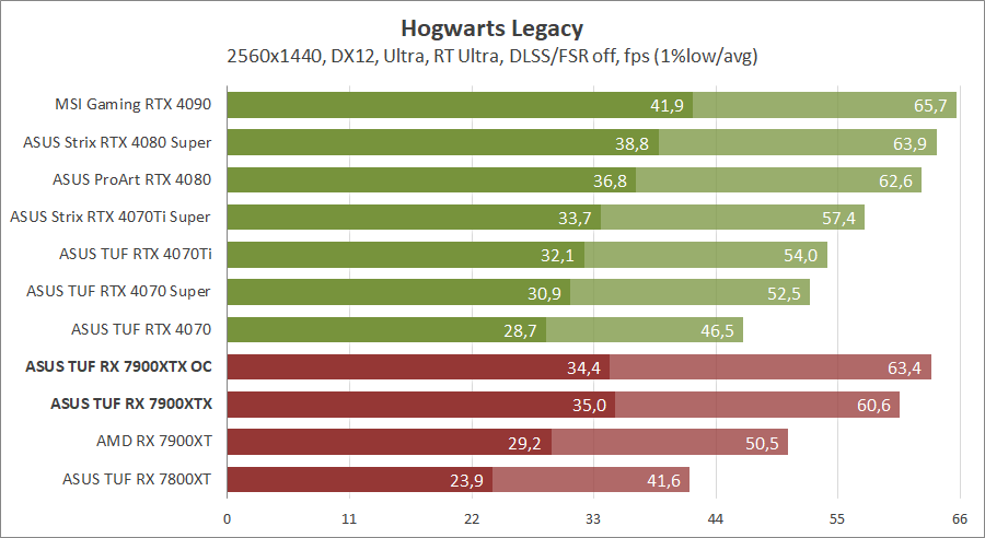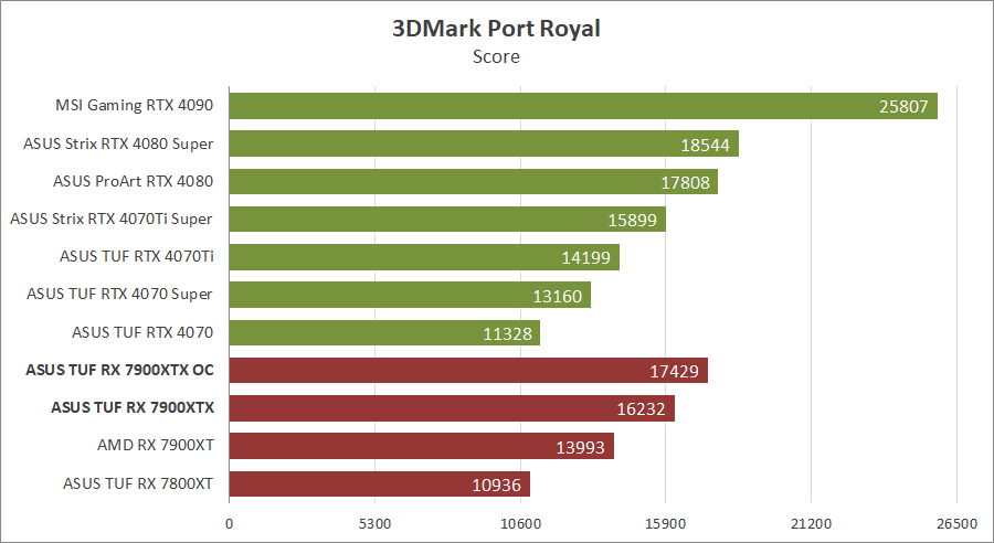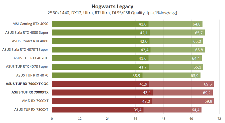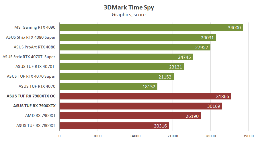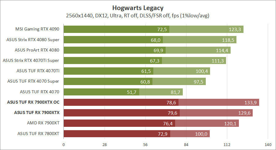 Для порівняння візьмемо карти MSI GeForce RTX 4090 Gaming X Trio, ASUS ROG-STRIX-RTX4080S-O16G-GAMING, PROART-RTX4080-O16G, ROG-STRIX-RTX4070TIS-O16G-GAMING, TUF-RTX4070S-O12G-GAMING з TUF-RTX4070TI-O12G-GAMING та TUF-RTX4070-O12G-GAMING, а також референсну Radeon RX 7900 XT з ASUS TUF-RX7800XT-O16G-GAMING.