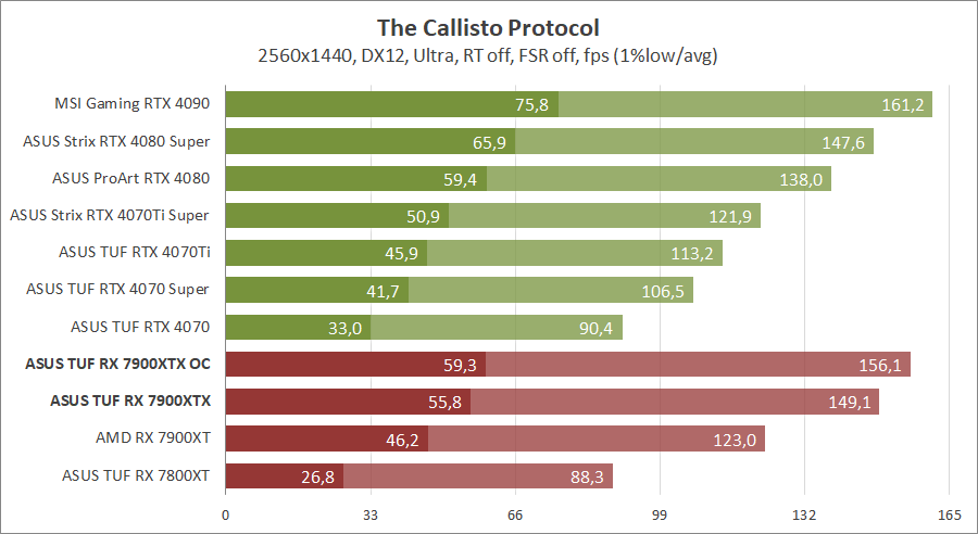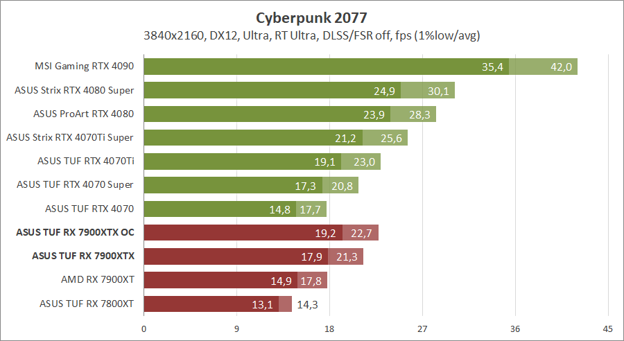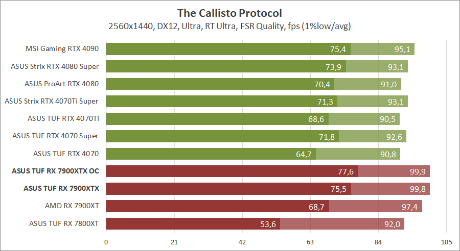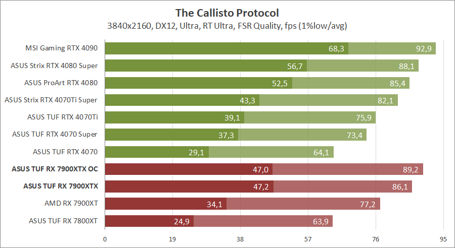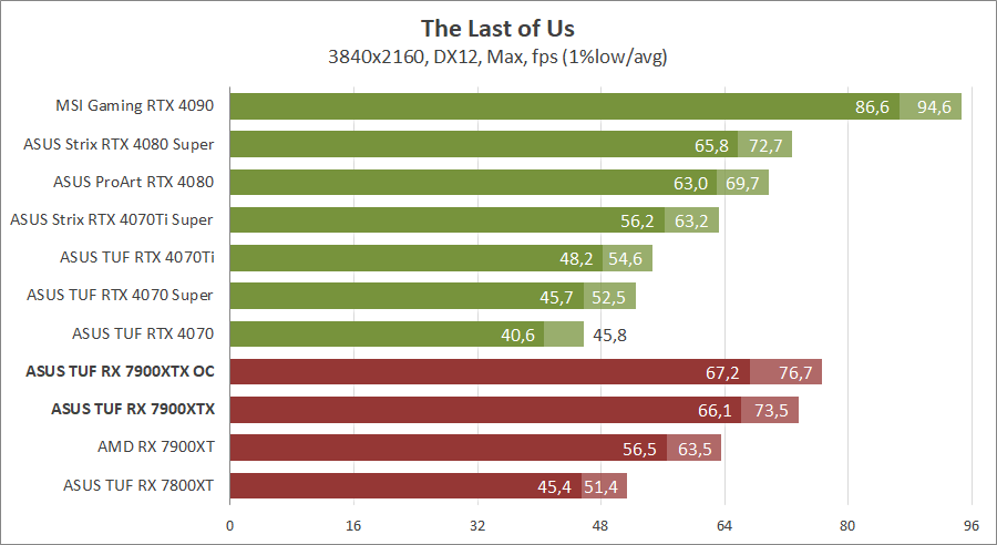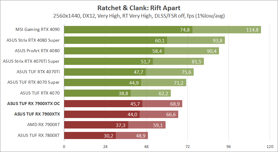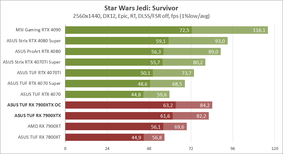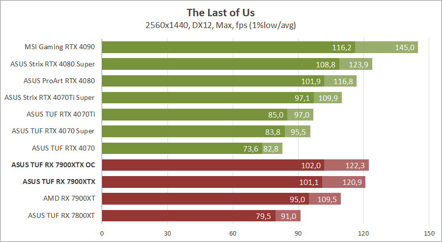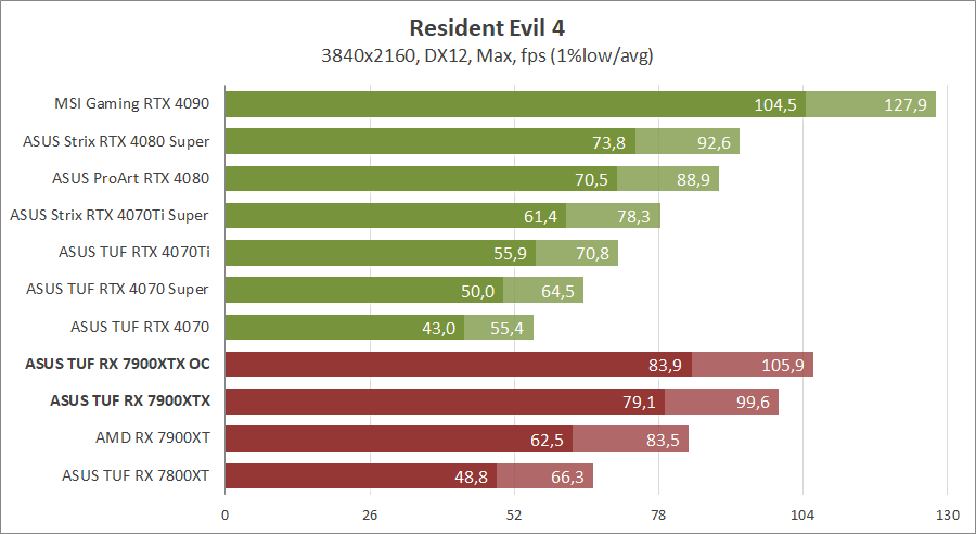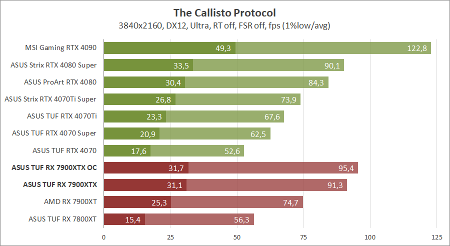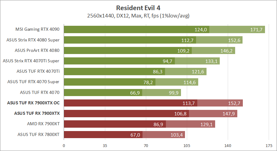 Перша гра й в нас Radeon RX 7900 XTX демонструє показники на рівні GeForce RTX 4090, але вмикання трасування променів дуже серйозно впливає на швидкодію і карта виступає поруч з доступними «зеленими» опонентами.
