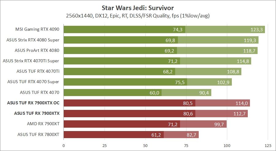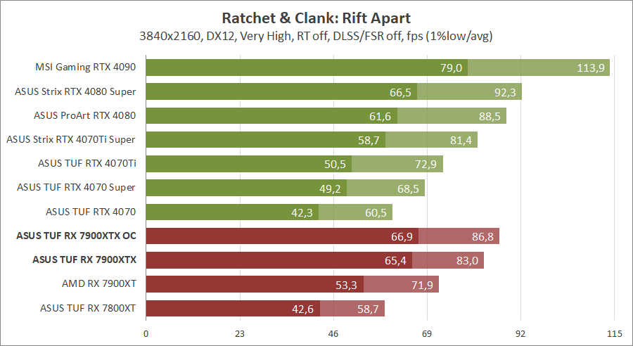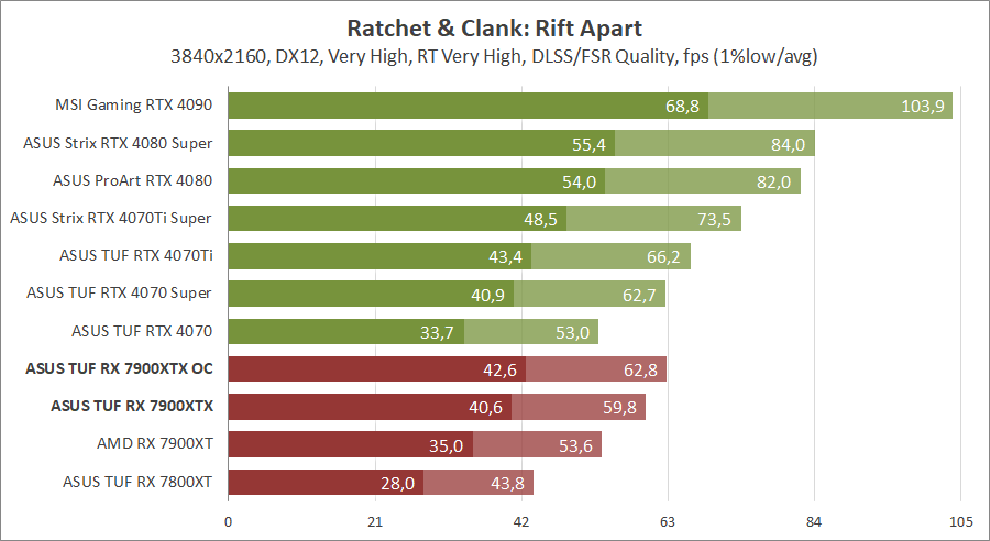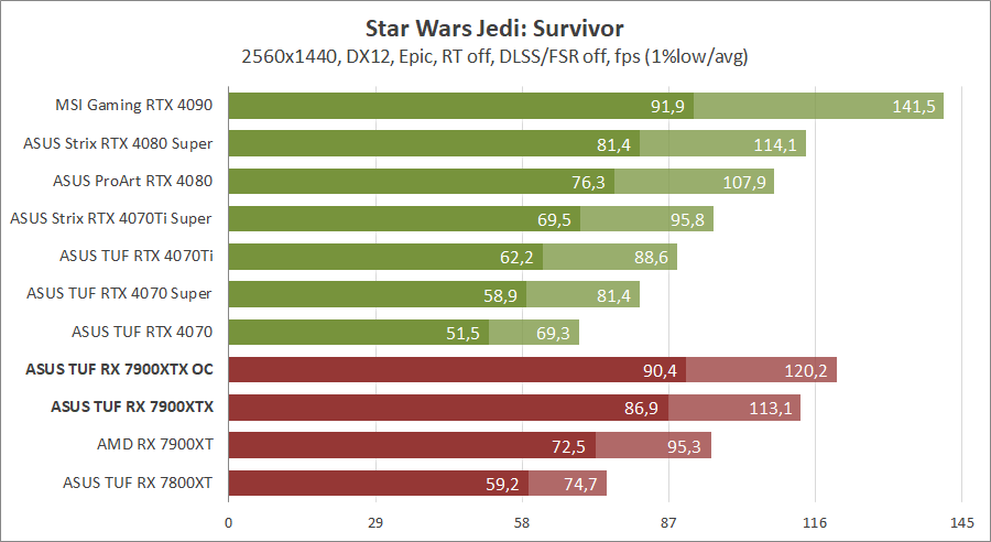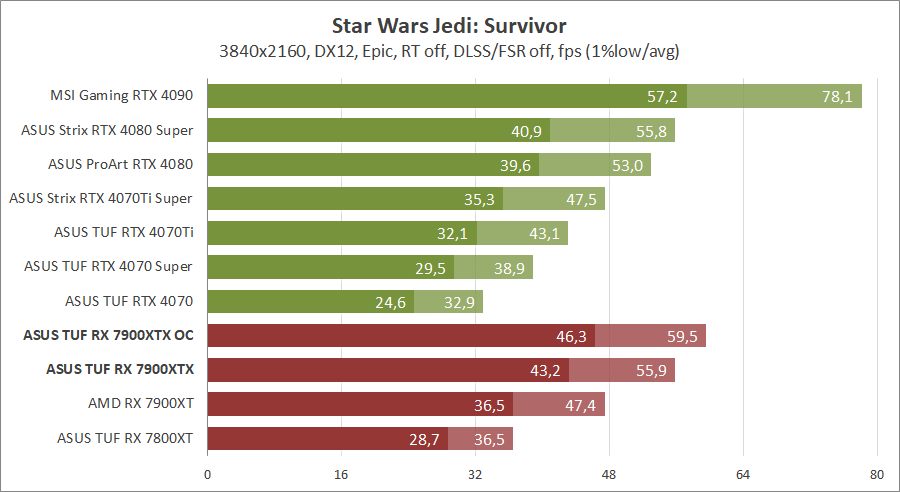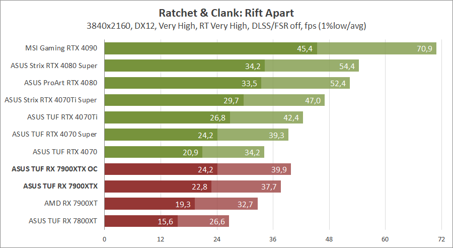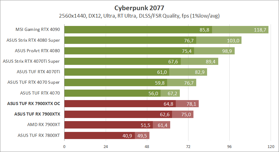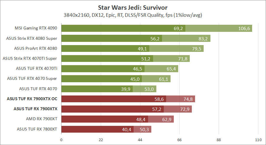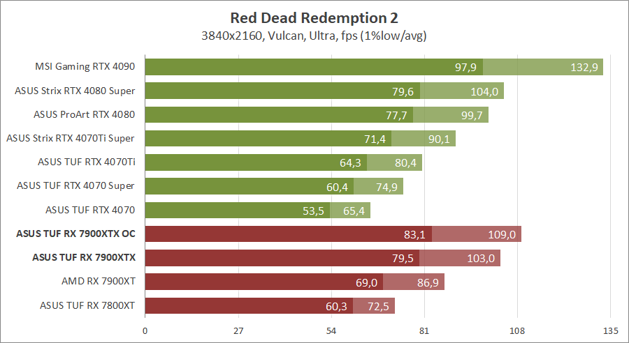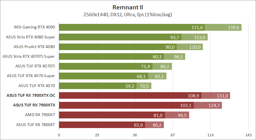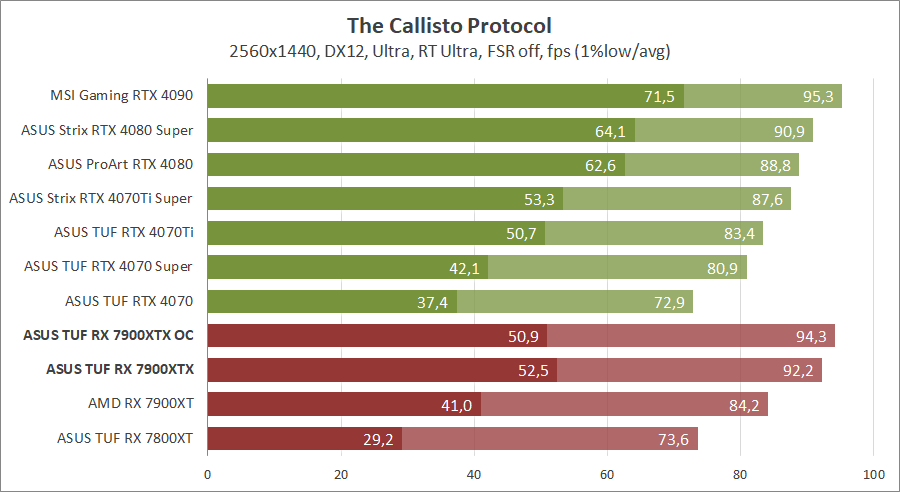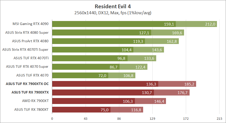 Перша гра й в нас Radeon RX 7900 XTX демонструє показники на рівні GeForce RTX 4090, але вмикання трасування променів дуже серйозно впливає на швидкодію і карта виступає поруч з доступними «зеленими» опонентами.