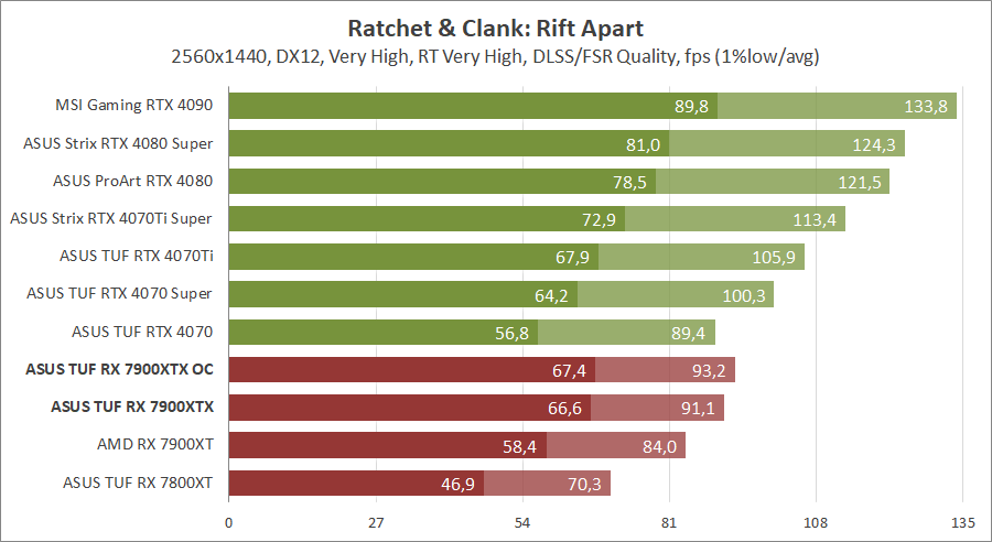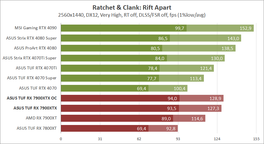 Тут все без змін, адаптер Radeon RX 7900 XTX гірший за GeForce RTX 4080 Super в Quad HD, але кращій в 4K. «Зелений» топ на іншому рівні.