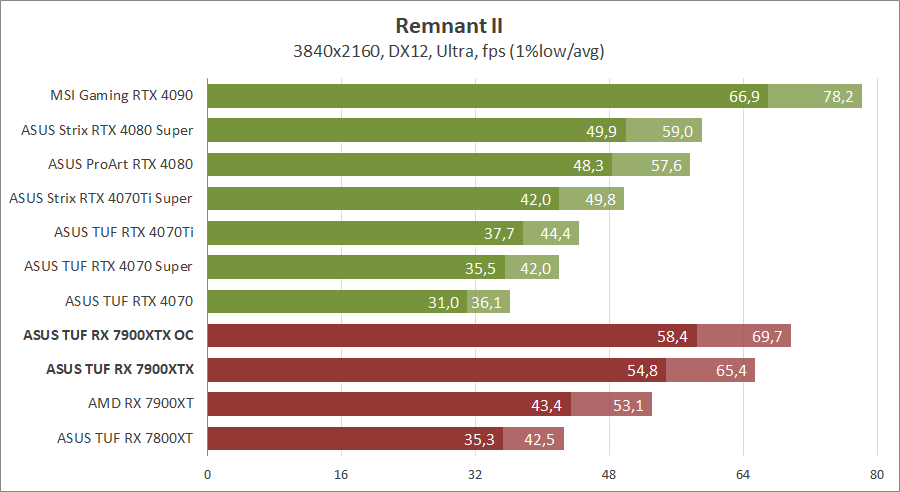 Гра на базі UE5 непогано йде на відеокарті Radeon RX 7900 XTX, яка залишає всіх позаду, окрім «зеленого» топа.