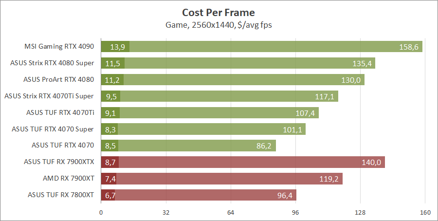 За декілька місяців ціни на Super-новинки трохи знизилися й вони тепер не виглядають відірваними від реальності, як це було в лютому. В цілому, вартість всіх карт поменшала, тож привабливими стали не тільки нові GeForce. Якщо порівнювати графічні адаптери між собою, то Radeon й надалі є цікавішими за «зелених» опонентів. Для роздільної здатності 2560x1440 найоптимальнішою покупкою на вітчизняному ринку можна назвати модель Radeon RX 7800 XT — у середньому майже 100 кадрів за секунду з Ultra-якістю буде коштувати лише 6,7 долара за кожен fps. Nvidia нічого подібного з доступних адаптерів запропонувати не може, лише новий GeForce RTX 4070 Super краще відпрацьовує кожен витрачений на нього долар. Відеокарта Radeon RX 7900 XTX вийде найдорожчою з продуктів AMD, але вона швидша за GeForce RTX 4080 (Super), а коштує майже у 1,5 раза менше. Головний козир GeForce — промені, але вони не безкоштовні й не завжди дають серйозно обійти «червоних» конкурентів. Варте це зайвих 100–400 доларів — вирішувати вже користувачу.