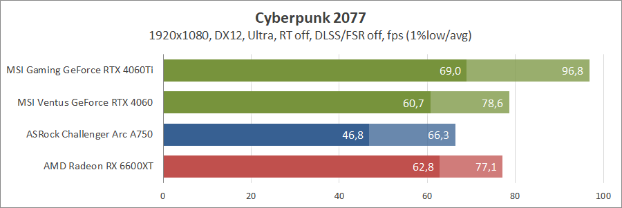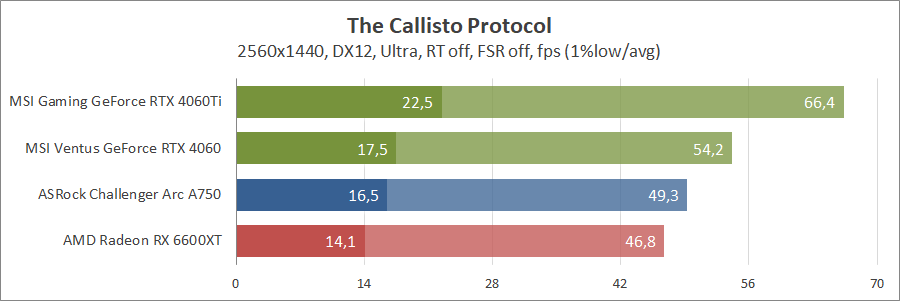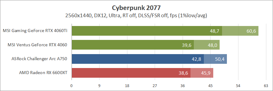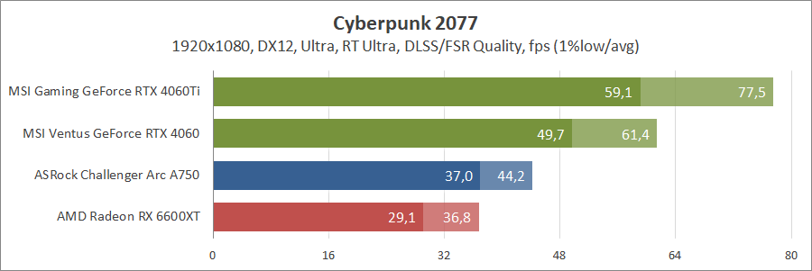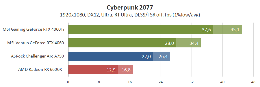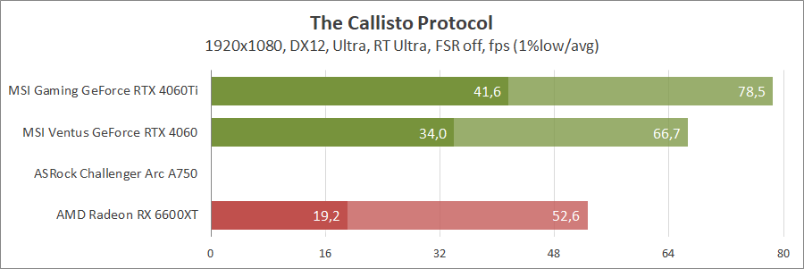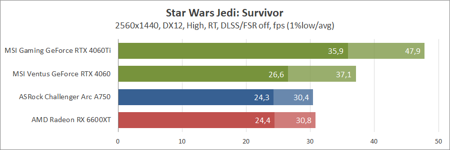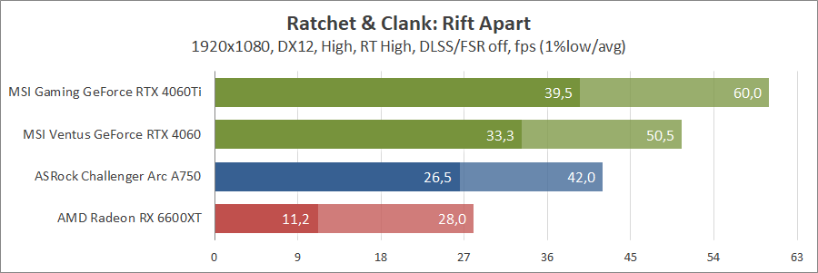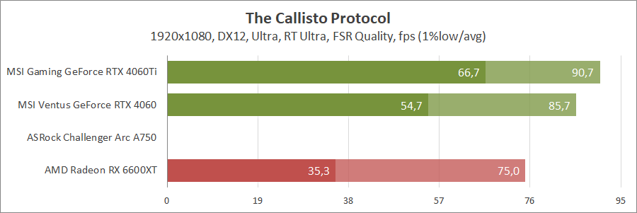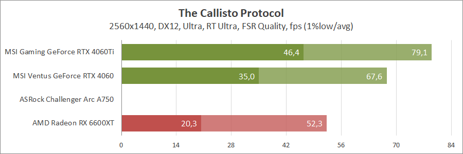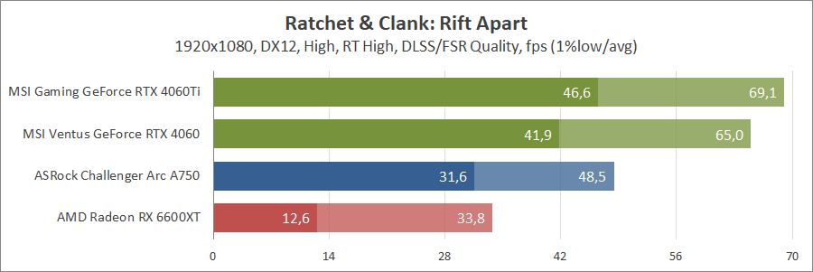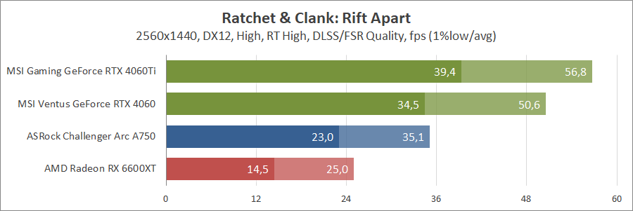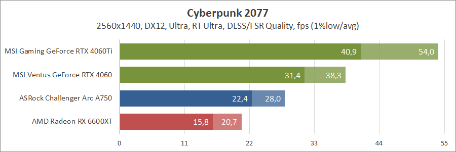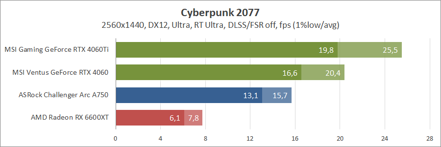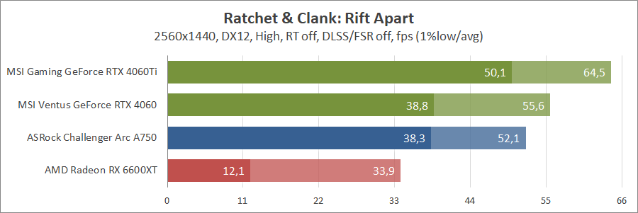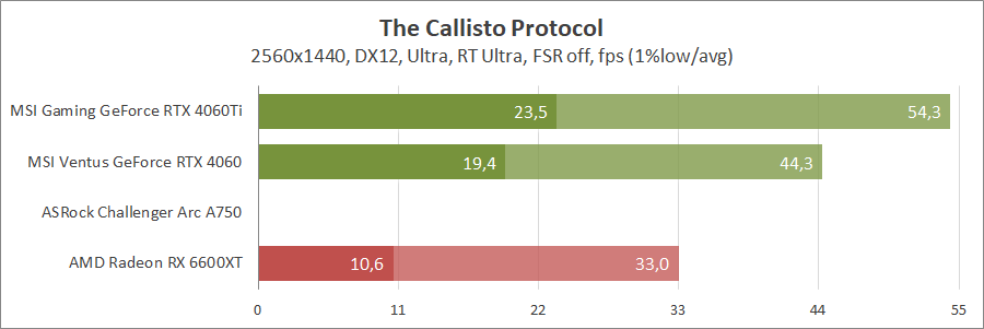 При активуванні трасування променів та технології масштабування FSR 2 карта Intel не змогла пройти тестування, а без них вона демонструє непоганий результат, хоча й не дотягує до GeForce.
