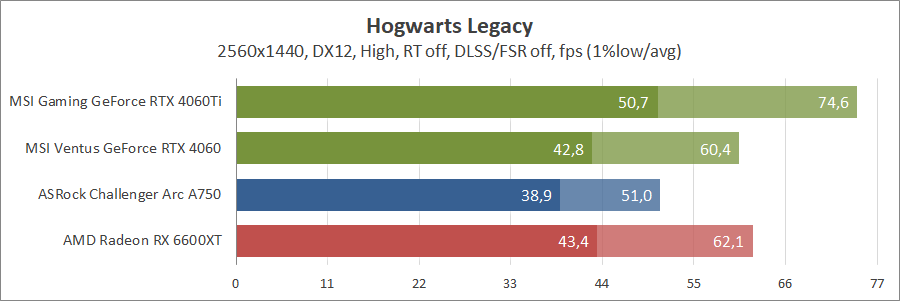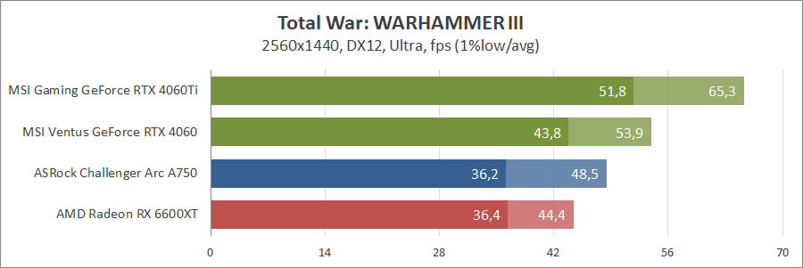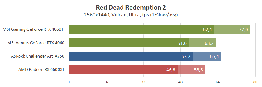 Знову GeForce RTX 4060 в Quad HD кращій за всіх, далі йде Arc A750, а замикає їх Radeon RX 6600 XT. Зі зменшенням роздільної здатності «червона» та «синя» карта демонструють однаковий результат.