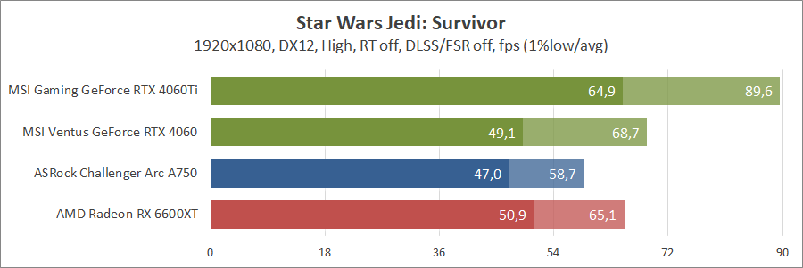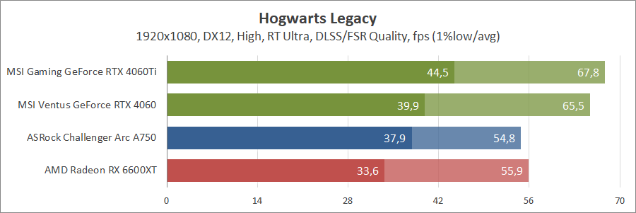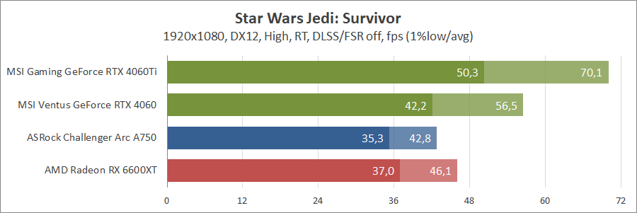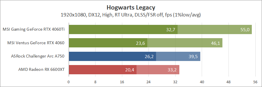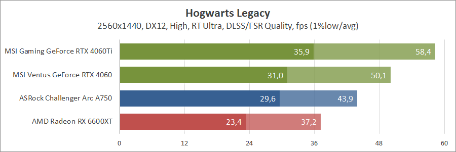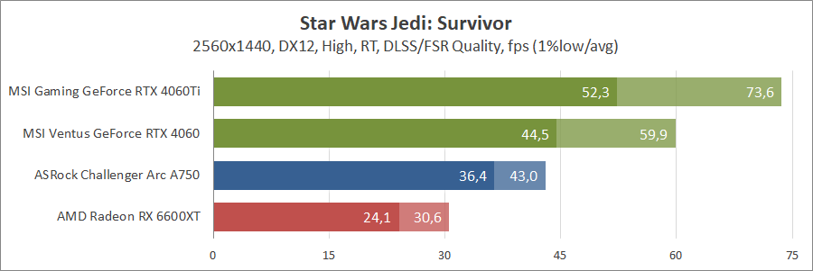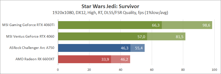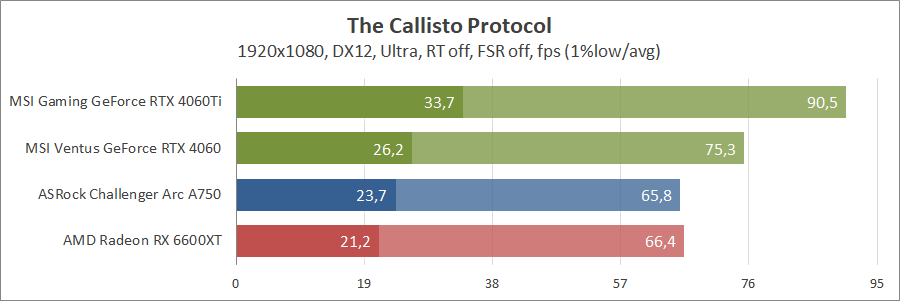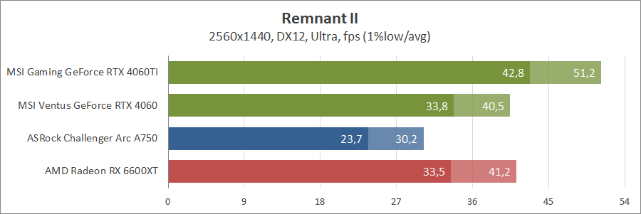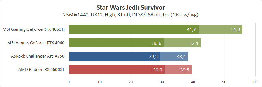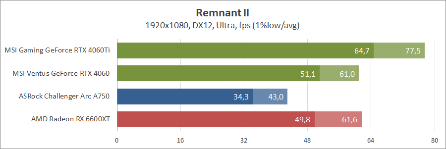 Ще одна нова гра. Тут про оптимізацію ніхто не чув, тож Arc вийшов не дуже. Відеокарти GeForce RTX 4060 та Radeon RX 6600 XT демонструють однаковий результат.