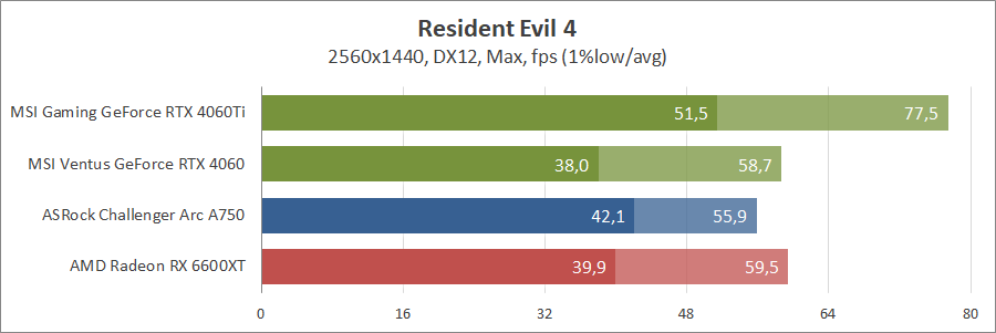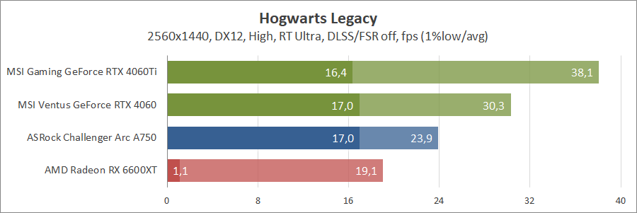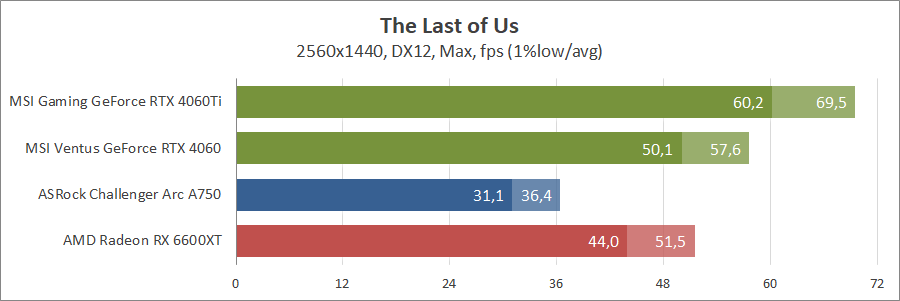 Тут без променів кращі показники у Radeon RX 6600 XT, тоді як з ними GeForce RTX 4060 обходить навіть Arc A750.