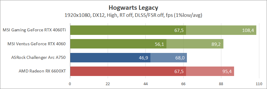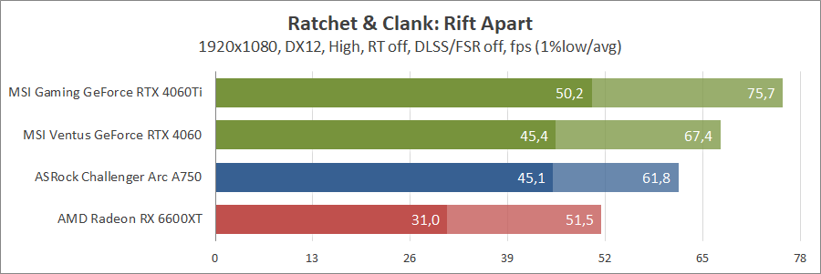 Тестування в ігрових бенчмарках відбувалося при роздільній здатності 2560х1440 та 1920х1080 з пресетами якості графіки High або Ultra. Також були додані режими з активованими, де це можливо, параметрами трасування променів. Додатково проводилося тестування з технологіями DLSS чи FSR в важких для відеокарт іграх, для карти Arc A750 використовувалася технологія Intel XeSS. В грі Hogwarts Legacy відбувалася пробіжка протягом хвилини через містечко Hogsmeade у бік Old Fool, в Star Wars Jedi: Survivor, Ratchet & Clank: Rift Apart, Remnant II та Resident Evil 4 відбувалася прогулянка протягом хвилини на початку стартового рівня, в The Last of Us — на рівні після прологу.