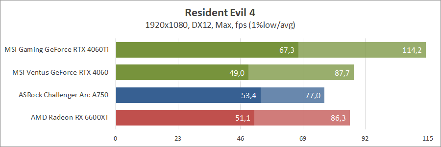 Нова гра в нашому тестуванні. Швидкодія «червоної» карти гірша за всіх у 1,5 раза, і це за налаштуваннями високого рівня, навіть не максимального. Arc гарно себе показав, а GeForce RTX 4060 обходить своїх опонентів і навіть з променями почувається непогано.