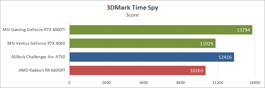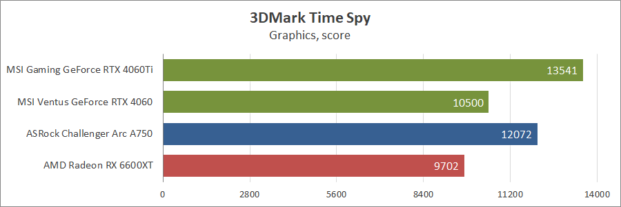 Цілком стандартні характеристики для карт рівня GeForce 3060. Подивимося, як Arc A750 виявить себе серед конкурентів.