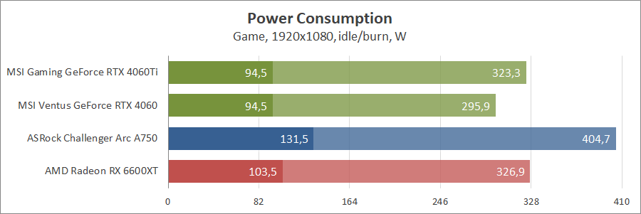Карта GeForce RTX 4060 виявилася економічною, тоді як Arc A750 споживає значно більше інших.