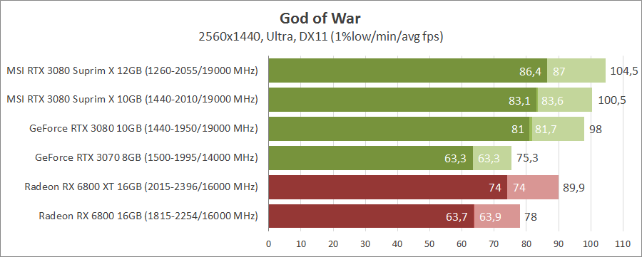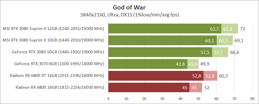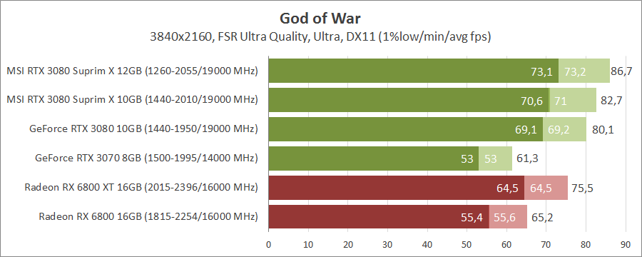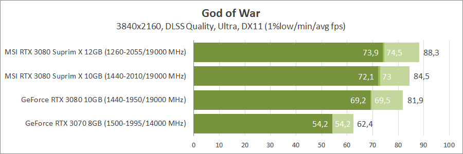 Якщо хочете насолодитися красивими північними пейзажами та запеклими битвами God of War в 4K, оптимальним рішенням є відеокарти серії GeForce RTX 3080. Максимальний комфорт забезпечить MSI GeForce RTX 3080 Suprim X 12G, яка оснащена потужним охолодженням та працює із заводським прискоренням. Ця відеокарта на 8–9% швидше за стару версію GeForce RTX 3080 з меншим обсягом пам'яті. Якщо порівнювати ідентичні за частотами версії MSI Suprim, різниця між GeForce RTX 3080 з різним обсягом відеобуфера на рівні 4%. А оскільки грі цілком вистачає 10 ГБ для максимальної роздільної здатності, ця різниця повністю зумовлена різною конфігурацією GPU та шини пам'яті.