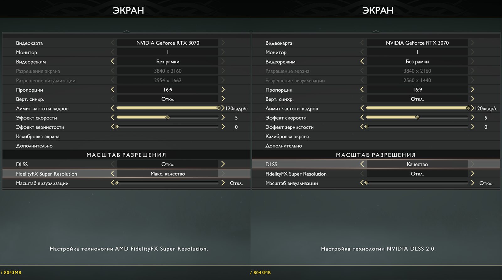 Відеокарти GeForce RTX 3080 упевнено оминають Radeon RX 6800 XT. Проте молодша Radeon RX 6800 трохи виграє у GeForce RTX 3070. Останні показують відмінні результати у форматі 2560x1440, але слабкі для 4K. У поєднанні з масштабування вони здатні забезпечити комфортну частоту кадрів. Якісні режими AMD FSR та Nvidia DLSS демонструють мізерні відмінності від оригінального формату 4K. Варто відзначити деякі переваги DLSS у зображенні дрібних елементів. Тому на відеокартах GeForce RTX можете сміливо використовувати якісні режими DLSS з високою роздільною здатністю. Перевага AMD FSR у доступності технології для всіх більш-менш актуальних відеокарт, включаючи колишні покоління. При виборі швидких профілів масштабування або зі зниженням роздільної здатності втрата якості картинки буде більш помітною, але цей компроміс може бути виправданий для відеокарт нижнього цінового сегмента.