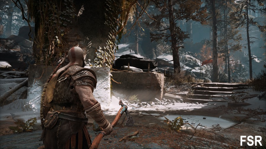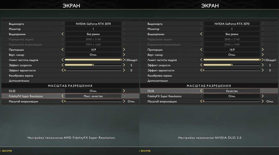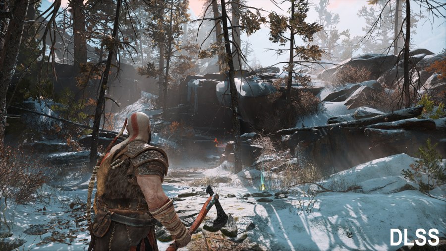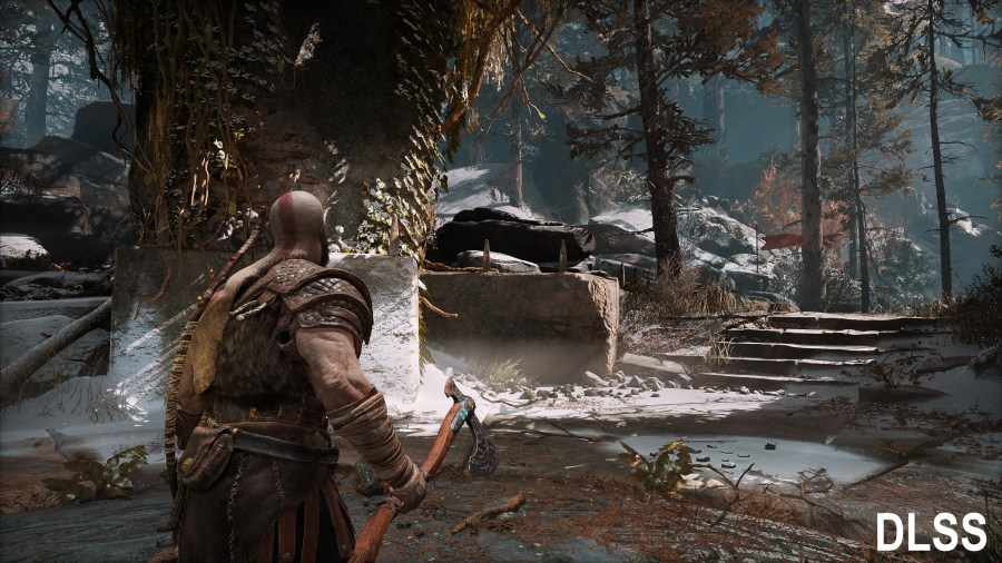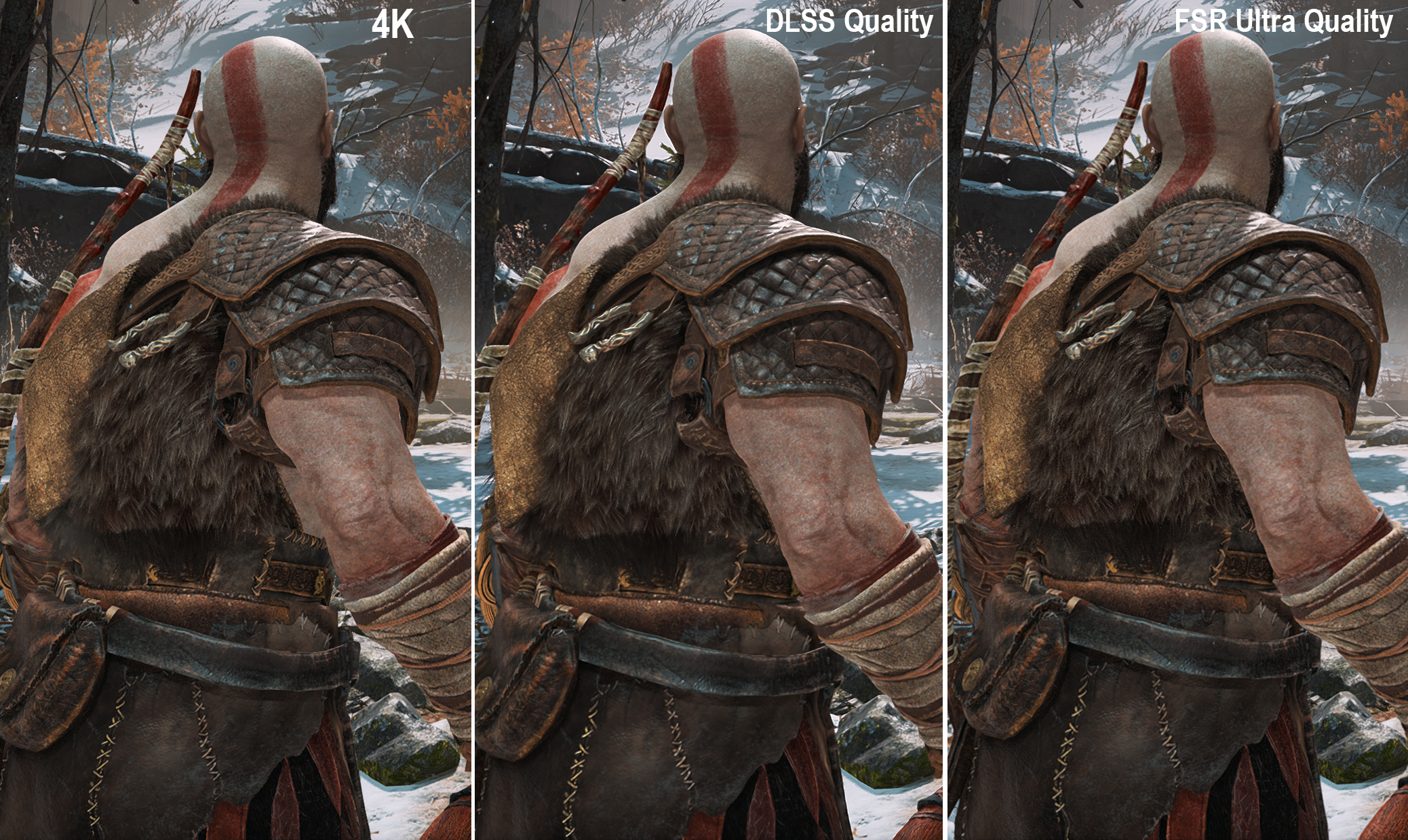 God of War чітко показує вхідну роздільну здатність при виборі різної якості DLSS або FSR. При форматі 4K найякісніший режим FSR Ultra Quality використовує 2954x1662 пікселів, режим FSR Ultra використовує 2560x1440. Якісний режим DLSS Quality передбачає вхідну роздільну здатність 2560x1440.