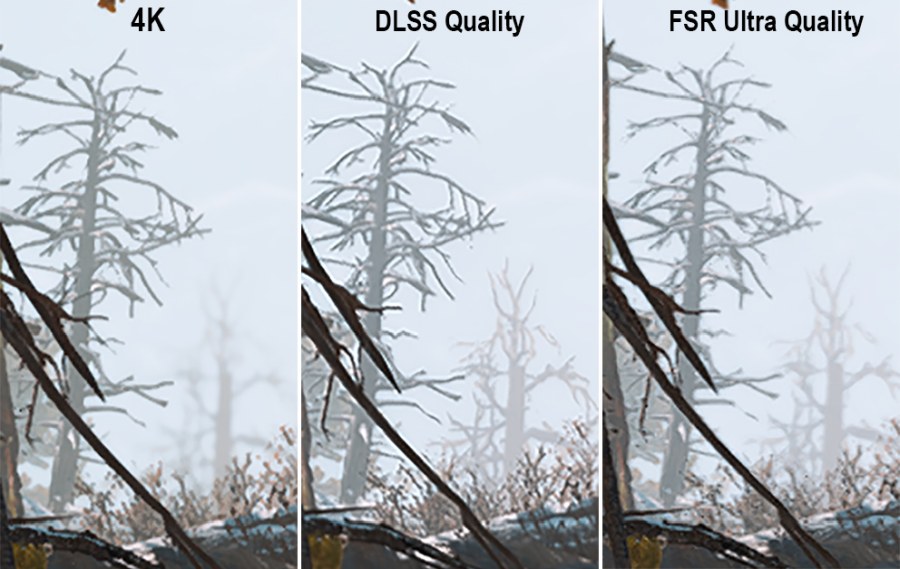 Технологія DLSS забезпечує найчіткіші контури гілок, тоді як з FSR помітна фрагментація. Слабка видимість далекого дерева пов'язана з динамічним ефектом туману.