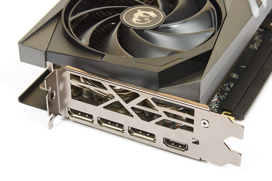 На задній планці з вирізами неправильної форми для виходу гарячого повітря є три роз’єми DisplayPort 1.4a та один HDMI 2.1a. Карта займає лише 2,5 слоти, що на тлі 3,5+ у топових продуктів є непоганим результатом.
