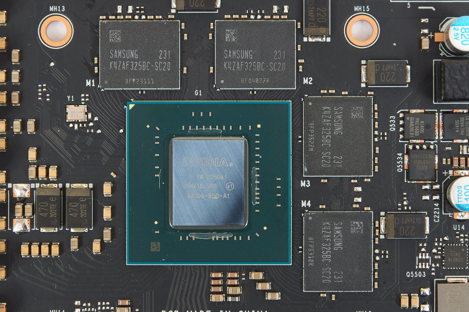 На плату встановлено чип AD106-350-A1 без захисної рамки, який взаємодіє з мікросхемами пам’яті через 128-бітну шину. Чотири чипи Samsung K4ZAF325BC-SC20 мають загальний обсяг у 8 ГБ.