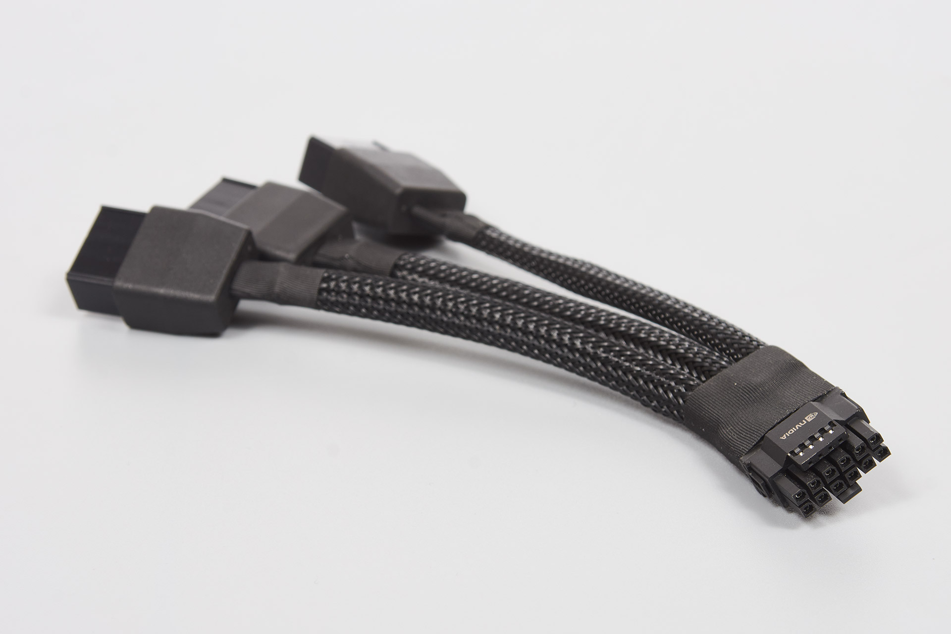 Перехідник має всього три дроти та розрахований на 450 ватів, і цього достатньо, бо звичайне енергоспоживання карти дорівнює 320 Вт, а максимальне — 400 Вт.