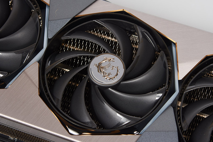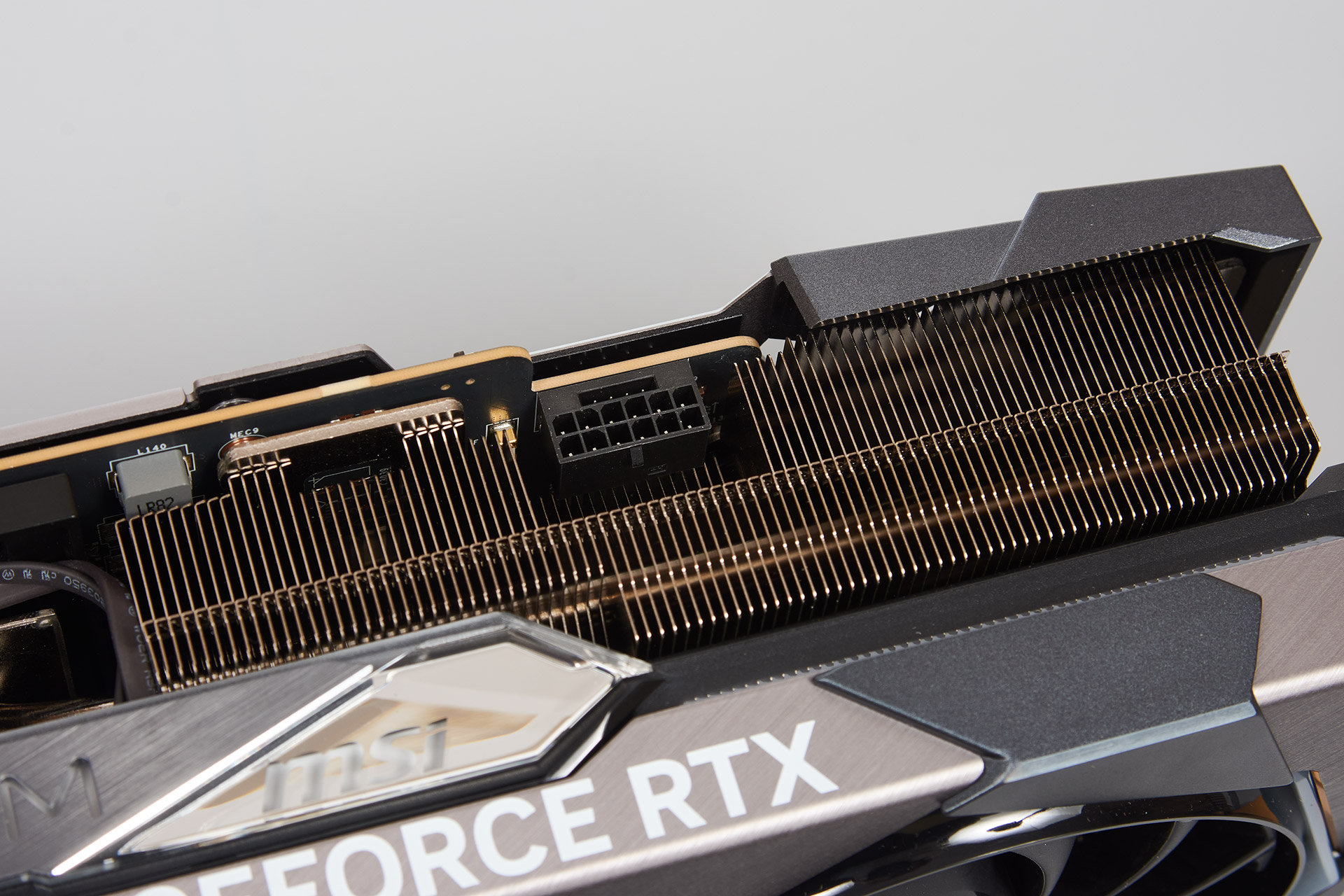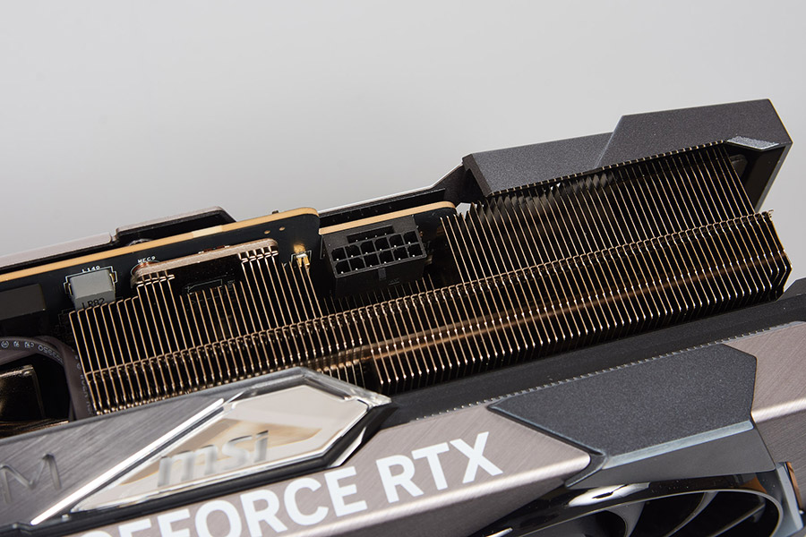 Радіатор ідентичний такому в GeForce RTX 4090 Suprim X 24G. Це все та ж випарна камера та дві секції тонких алюмінієвих пластин, які пронизують дві товстих та шість тонких теплових трубок. Використання такої системи охолодження дозволило тримати чип на прийнятному рівні при менших обертах вентиляторів, що добре впливає на рівень шуму. На тлі такої СО вже чути дроселі, але не значно.
