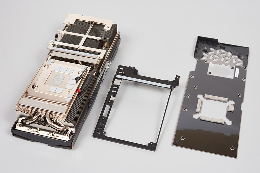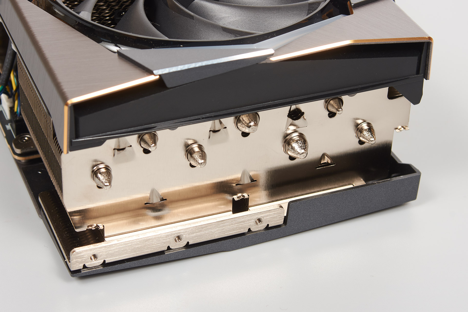 Пластина несе не тільки захисну функцію, а ще й бере участь в охолодженні елементів біля GPU. Рамка також допомагає в охолоджені DrMOS та дроселів з лицевої сторони, а також посилює друковану плату. Крім того, до неї прикручується задня планка.