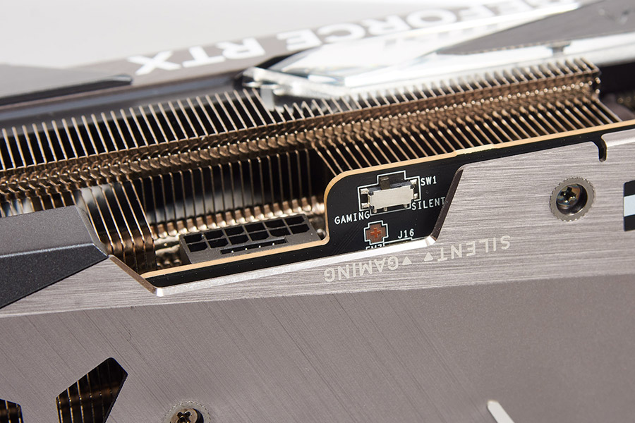Біля нього на зворотному боці знаходиться перемикач між BIOS режимів Gaming та Silent. Враховуючи й так невеличкий рівень шуму від карти, сенсу в останньому ніякого немає.