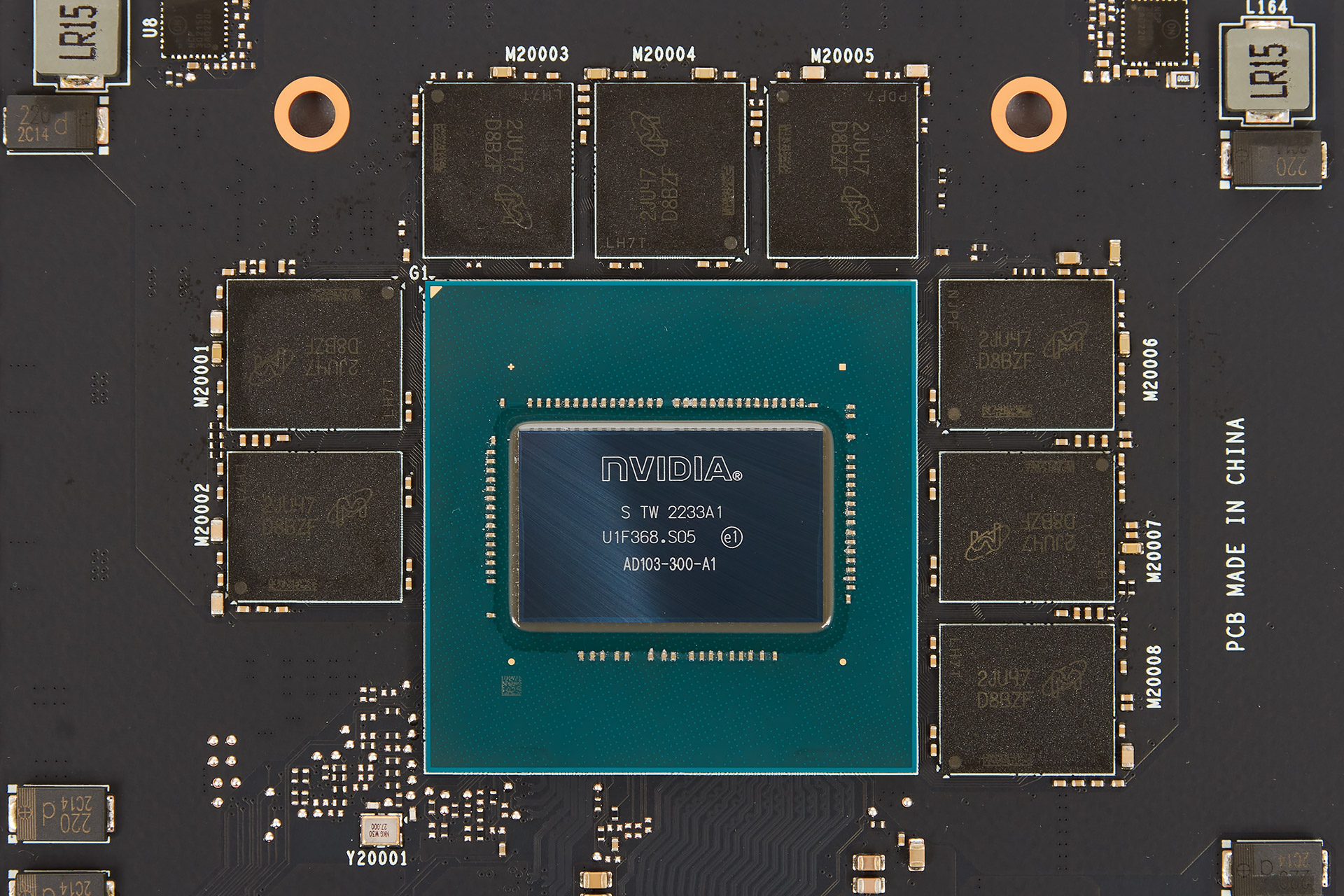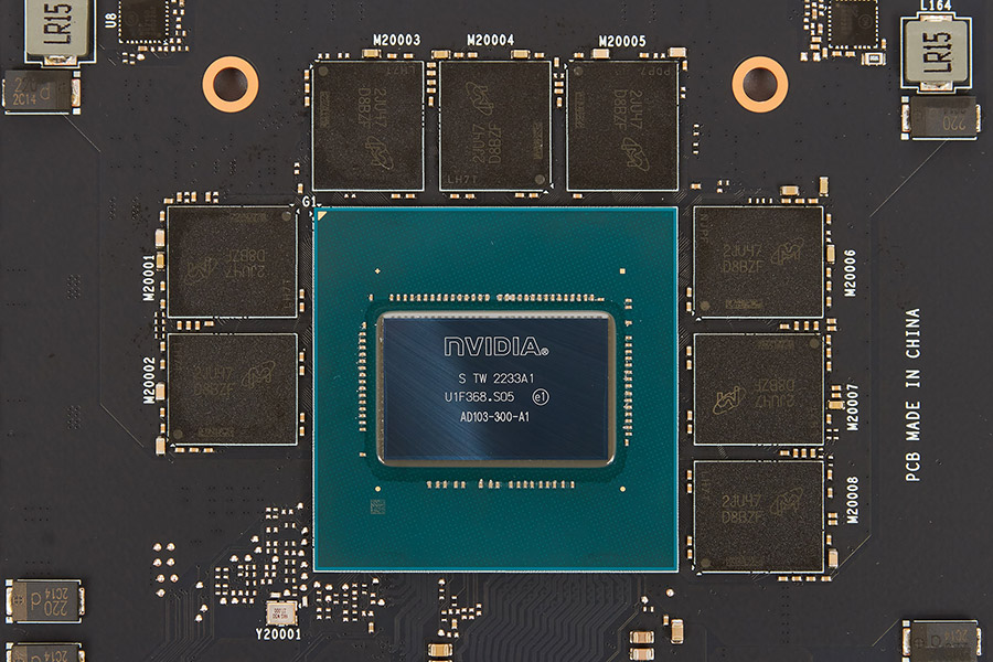 Чип AD103-300-A1 позбавлений захисної рамки та взаємодіє з пам’яттю GDDR6X через 256-бітну шину. Відеобуфер обсягом 16 ГБ набраний з восьми мікросхем Micron 2JU47D8BZF.