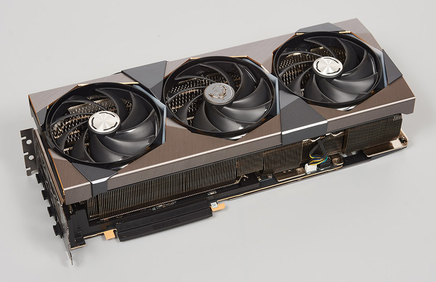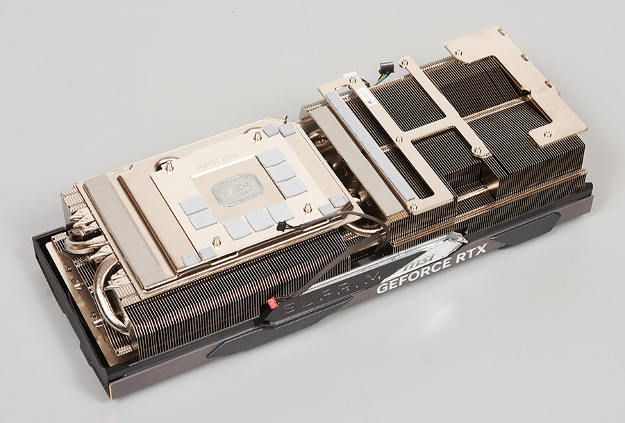 Радіатор ідентичний такому в GeForce RTX 4090 Suprim X 24G. Це все та ж випарна камера та дві секції тонких алюмінієвих пластин, які пронизують дві товстих та шість тонких теплових трубок. Використання такої системи охолодження дозволило тримати чип на прийнятному рівні при менших обертах вентиляторів, що добре впливає на рівень шуму. На тлі такої СО вже чути дроселі, але не значно.