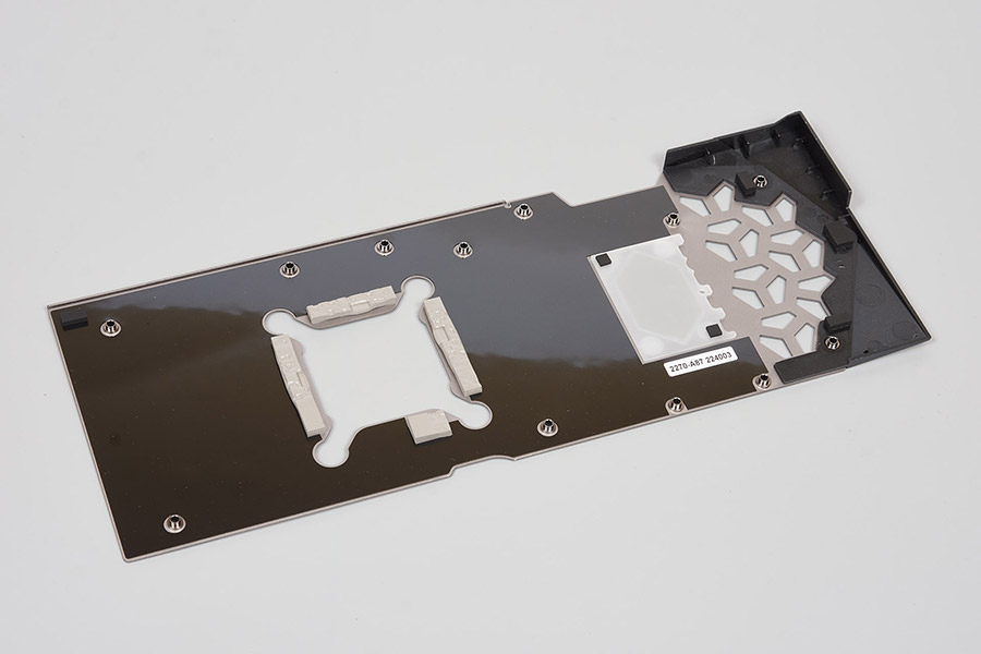 Пластина несе не тільки захисну функцію, а ще й бере участь в охолодженні елементів біля GPU. Рамка також допомагає в охолоджені DrMOS та дроселів з лицевої сторони, а також посилює друковану плату. Крім того, до неї прикручується задня планка.