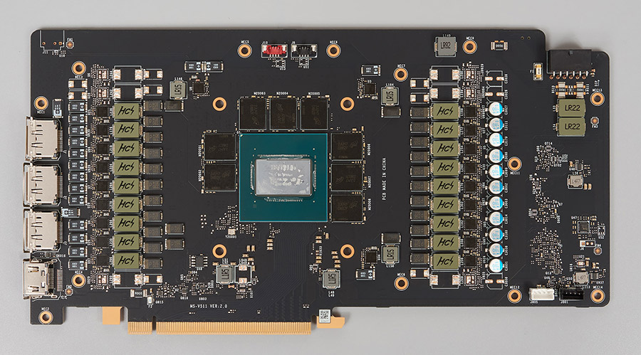 Чип AD103-300-A1 позбавлений захисної рамки та взаємодіє з пам’яттю GDDR6X через 256-бітну шину. Відеобуфер обсягом 16 ГБ набраний з восьми мікросхем Micron 2JU47D8BZF.