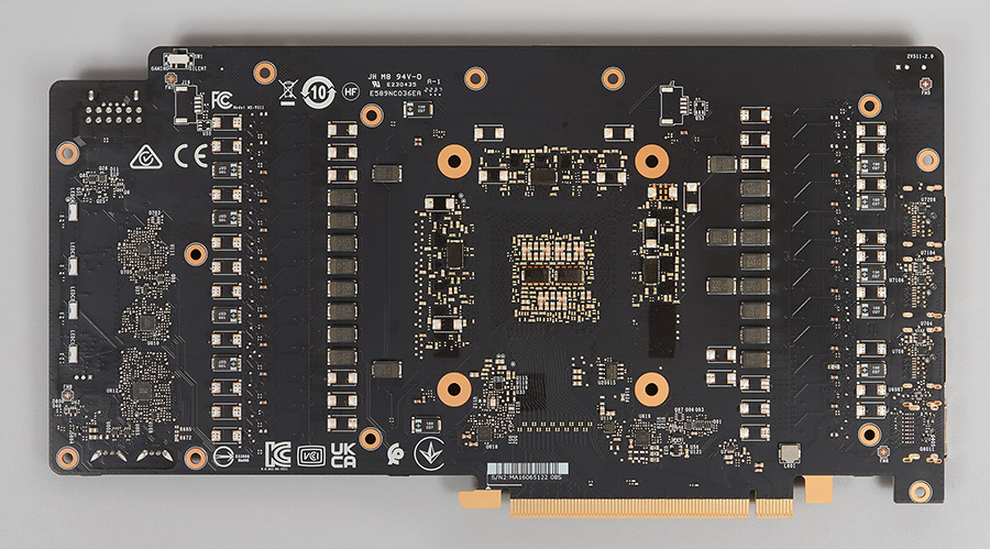 Друкована плата займає майже всю площу карти, лише трошки місця залишається для проходження повітря від крайнього вентилятора. По розміщенню елементів вона нагадує плату старшої моделі, в якої також були округлені кути.
