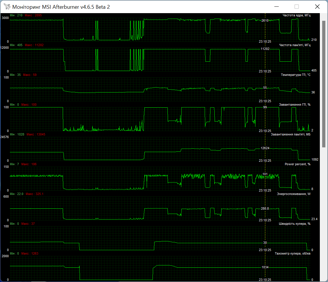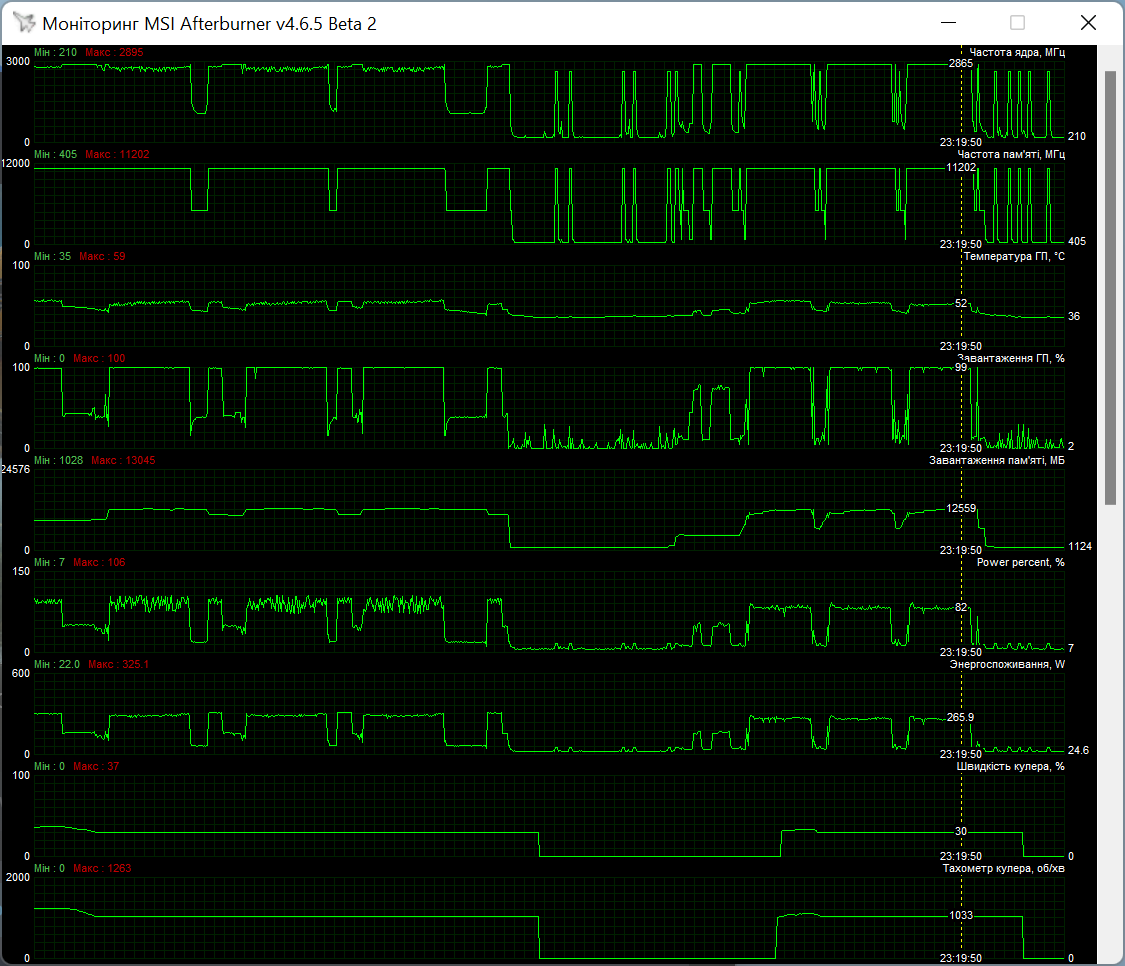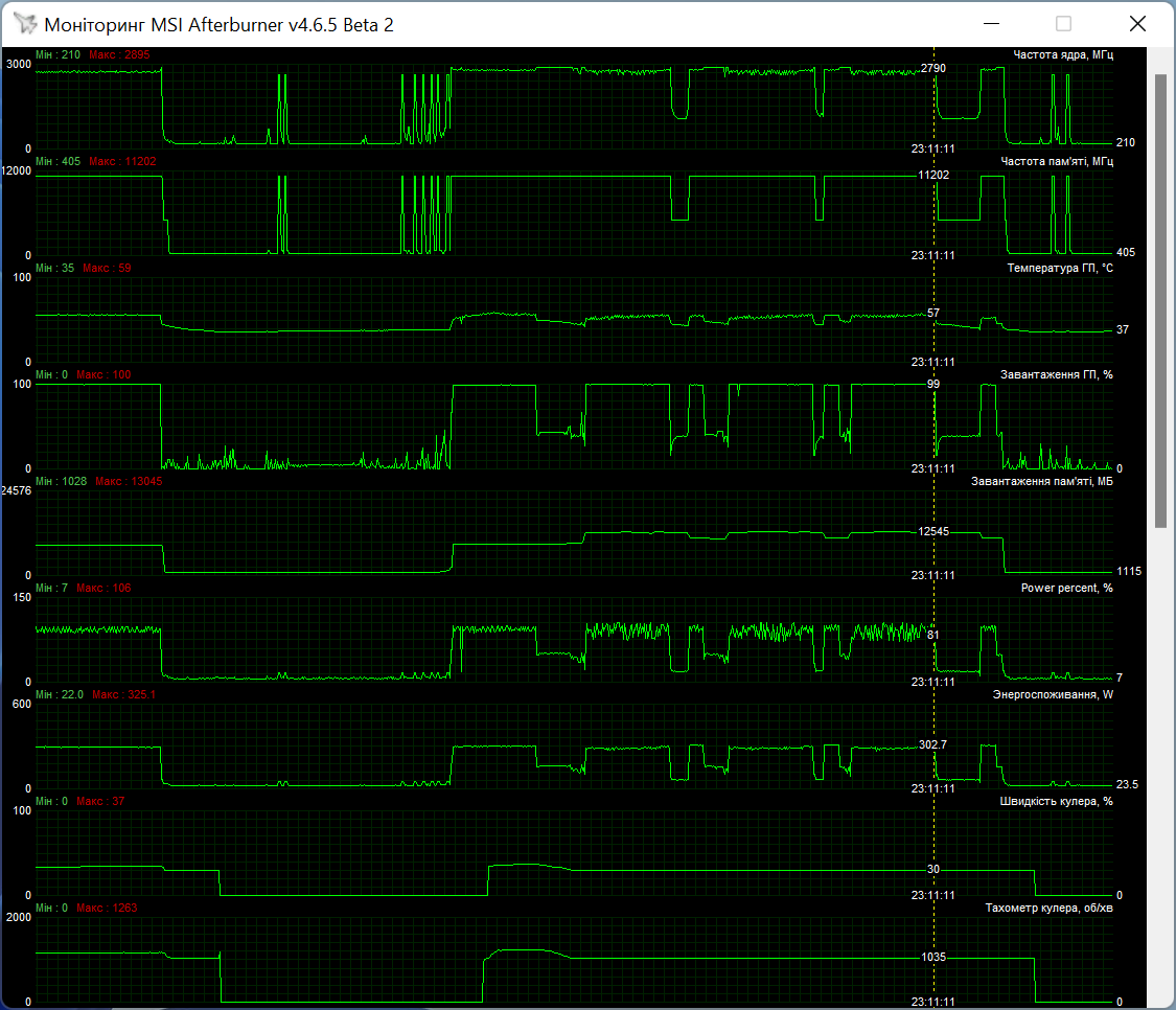 В реальності відеокарта працювала на 2610–2790 МГц у важких іграх та могла підвищувати частоту до 2835–2865 МГц, якщо проєкт вже не так навантажував адаптер. Частіше всього було саме 2865 МГц. Температура GPU сягала 55–57 °C, а швидкість вентиляторів не перевищувала 1035 об/хв з деякими стрибками на декілька сотень обертів.