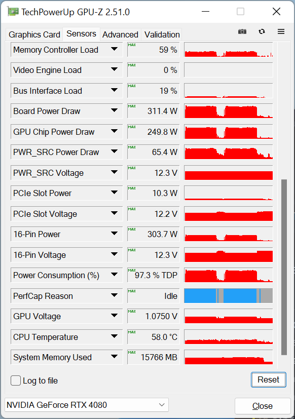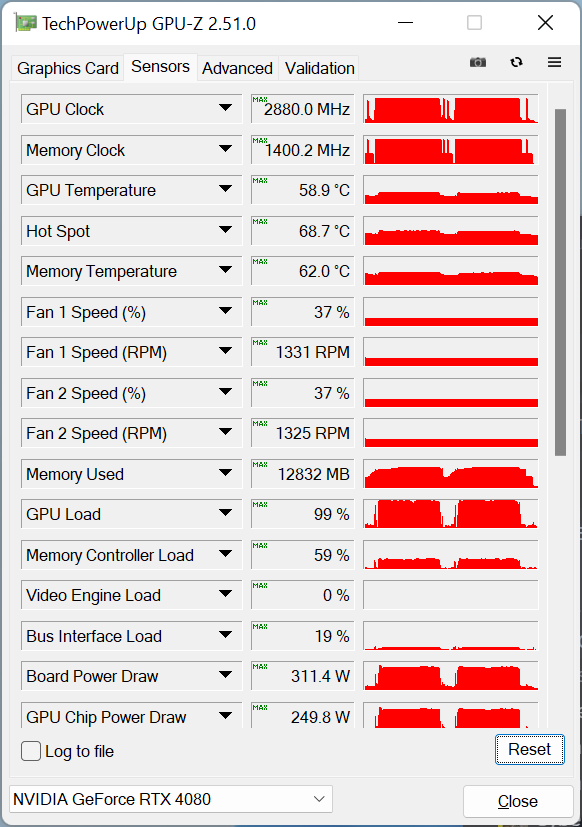 Максимальні значення теж були на прийнятному рівні: 59 градусів для чипа (68 °C для Hot Spot) та 62 градуси для пам’яті, швидкість вентиляторів — 1330 об/хв, і це дуже непогані показники. Звісно, в закритому корпусі та влітку все буде інакше.